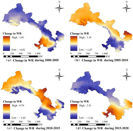 During the two periods of 2005–2010 and 2010–2015, the spatial patterns of changes in water conservation services within Gansu Province’s ecosystems exhibited overall similarities. Increases in water conservation per unit were observed in the desert regions of the northwest and in areas such as Baiyin and Dingxi in the east. The maximum increase per unit pixel reached 1.16 × 105 m3 during 2005–2010 and 0.76 × 105 m3 during 2010–2015. In contrast, the decline was concentrated in the Gannan region. Notably, the Qilian Mountains area showed a significant decrease during 2010–2015, indicating a risk of vegetation cover degradation in these regions.