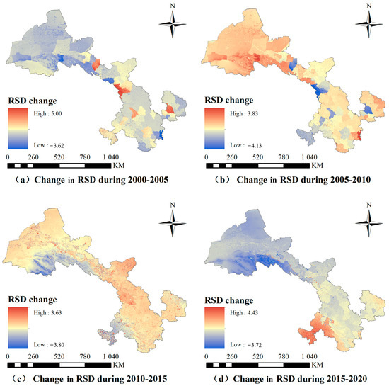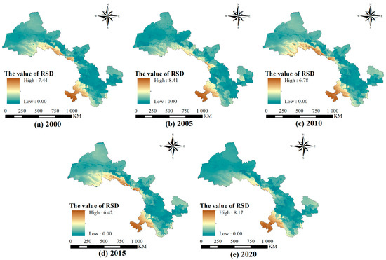 In 2000, the maximum RSD value per pixel in Gansu Province was 7.44. Pixels with a low risk of supply–demand imbalance were mainly concentrated in the southwestern mountainous areas of Gannan Prefecture and parts of the Qilian Mountains in the northwest. The minimum RSD values were close to 0. Such pixels were predominantly distributed in highly urbanized areas, forming a high carrying pressure belt extending northwest–southeast across central Gansu, including cities such as Jiayuguan, Zhangye, Jinchang, Wuwei, and Lanzhou, as well as a deficit zone stretching southwest–northeast in the southeast, composed of cities such as Tianshui, Pingliang, and Qingyang.