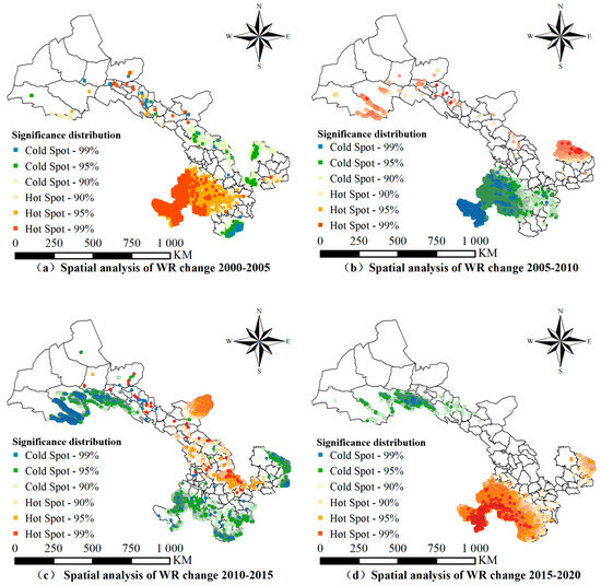 Figure 7 presents the results of the cold spot and hot spot analysis (p < 0.01) for the changes in water conservation supply–demand surplus across various prefectures in Gansu Province during the periods 2000–2005, 2005–2010, 2010–2015, and 2015–2020. The maps reveal that the water conservation capacity of the province underwent significant dynamic changes throughout the study intervals.