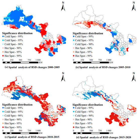 Spatial aggregation characteristics of the RSD (p < 0.05) changes in Gansu Province at five-year intervals were also analyzed, and the results are shown in Figure 8. The maps indicate that during 2000–2005, a distinct “hot in the south, cold in the north” spatial clustering pattern emerged. Hot spots were concentrated in Wuwei, Qingyang, Gannan, and Dingxi, while cold spots were predominantly observed in arid northern cities such as Jiuquan, Zhangye, and Jiayuguan, where desert landscapes cover a large proportion of the area.
