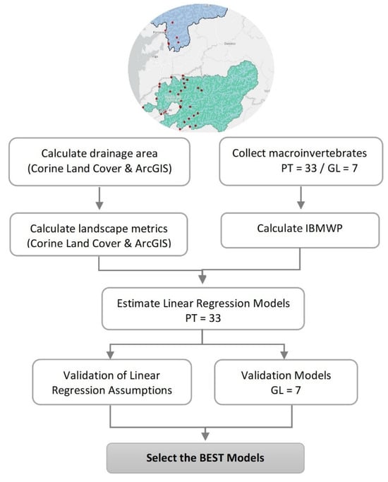 Benthic macroinvertebrates constitute a taxonomically and functionally diverse group of aquatic organisms, including insect larvae such as Ephemeroptera (mayflies), Plecoptera (stoneflies), and Trichoptera (caddisflies), as well as Diptera (e.g., Chironomidae), crustaceans, molluscs, and annelids (e.g., Oligochaeta). These organisms inhabit the substrates of rivers and streams and respond sensitively to changes in water quality, habitat structure, and hydromorphological conditions. Due to their relatively limited mobility and life cycles spanning several months, macroinvertebrate assemblages provide an integrated measure of ecological conditions over time, reflecting both natural and anthropogenic influences. Macroinvertebrate communities were sampled in a total of 40 sites, 7 in the Galicia region (sampled during the years 2010 and 2016) and 33 in Entre Douro e Minho (sampled in the years 2010 and 2015–2016). The higher number of Portuguese sites reflects broader data availability from national and regional WFD monitoring networks. In Galicia, only sites with complete information on IBMWP values and corresponding landscape metrics for the same sampling years were included, ensuring data consistency and regional representativeness.