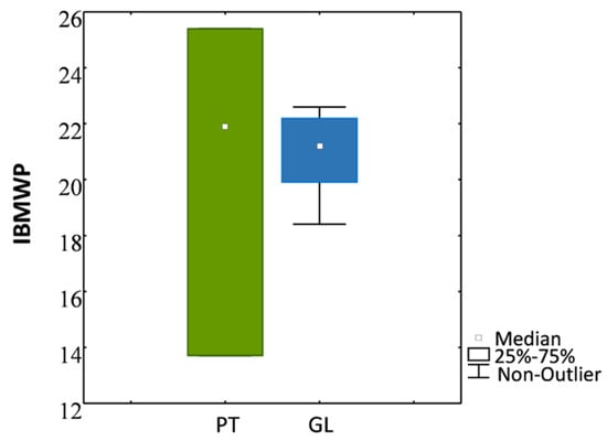 Of the 40 sites studied, 34 (85%) were classified as having very good biological quality encompassing all GL sites (100%) and most sites in the Entre Douro e Minho region (82%). However, in the remaining 18% of Entre Douro e Minho sites, water quality was more varied, spanning three quality classes: good (9%), fair (6%), and bad (3%). Notably, the variability in IBMWP scores was higher for Portuguese sites compared to GL ones, where the scores exhibited minimal variability, suggesting more consistent conditions in the GL region (Figure 3).