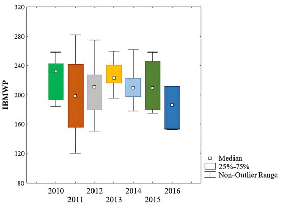 Box and whisker plot showing the IBMWP values variation within the seven studied years (2010–2016) in Galicia sites. The lower and upper end of boxes represent interquartile ranges (25%ile to 75%ile), range bars represent the maximum and minimum of non-outliers, small squares are medians. No significant differences were detected among years (Kruskal–Wallis, p = 0.27; ANOVA, p = 0.21).