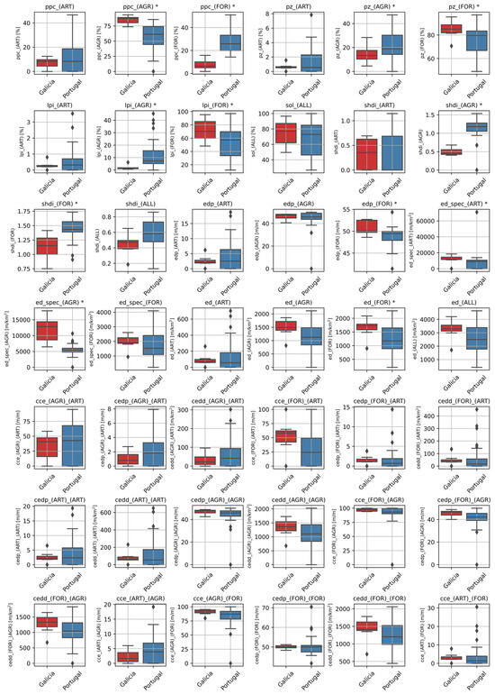 The analysis of landscape metrics highlights differences in land management practices between Galicia (GL) and Portugal (PT). These differences are particularly notable for agricultural and forested areas. A total of 42 landscape metrics, grouped into 11 categories, were calculated for different land uses. The values compared between the two regions (n = 33 for PT and n = 7 for GL) using the Shapiro–Wilk test (Figure 5). Comparisons were made using the Mann–Whitney U test for non-normal distributions or Student’s t-test for normal distributions. Significant differences (p < 0.05) were found in 13 metrics, highlighted with an asterisk (*) in Figure 5.
