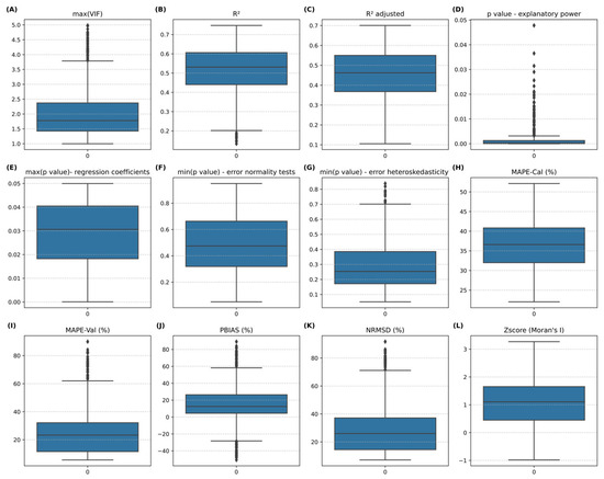 Boxplot showing the distribution of statistical variables and model performance metrics across all linear regression models. Key indicators include: (A) maximum Variance Inflation Factor among regressors; (B) R2; (C) adjusted R2; (D) p-value of explanatory power; (E) maximum p-value of regression coefficients; (F) minimum p-value for error normality tests; (G) minimum p-value for heteroskedasticity tests; (H) MAPE of the calibration subset (I); MAPE of the validation subset; (J); PBIAS of the calibration subset; (K) NRMSD; (L) Z-score from Moran’s I test for spatial autocorrelation of the error term. These metrics were used to select the best-performing models and ensure compliance with linear regression assumptions.