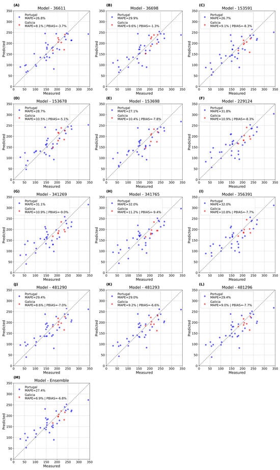 Scatter plots of selected linear regression models with the best performance (A–L) and the ensemble by mean of the twelve models (M), showing the relationship between observed and predicted IBMWP values. The plots illustrate model fit, predictive accuracy, and consistency across calibration (Portugal) and validation (Galicia) datasets.