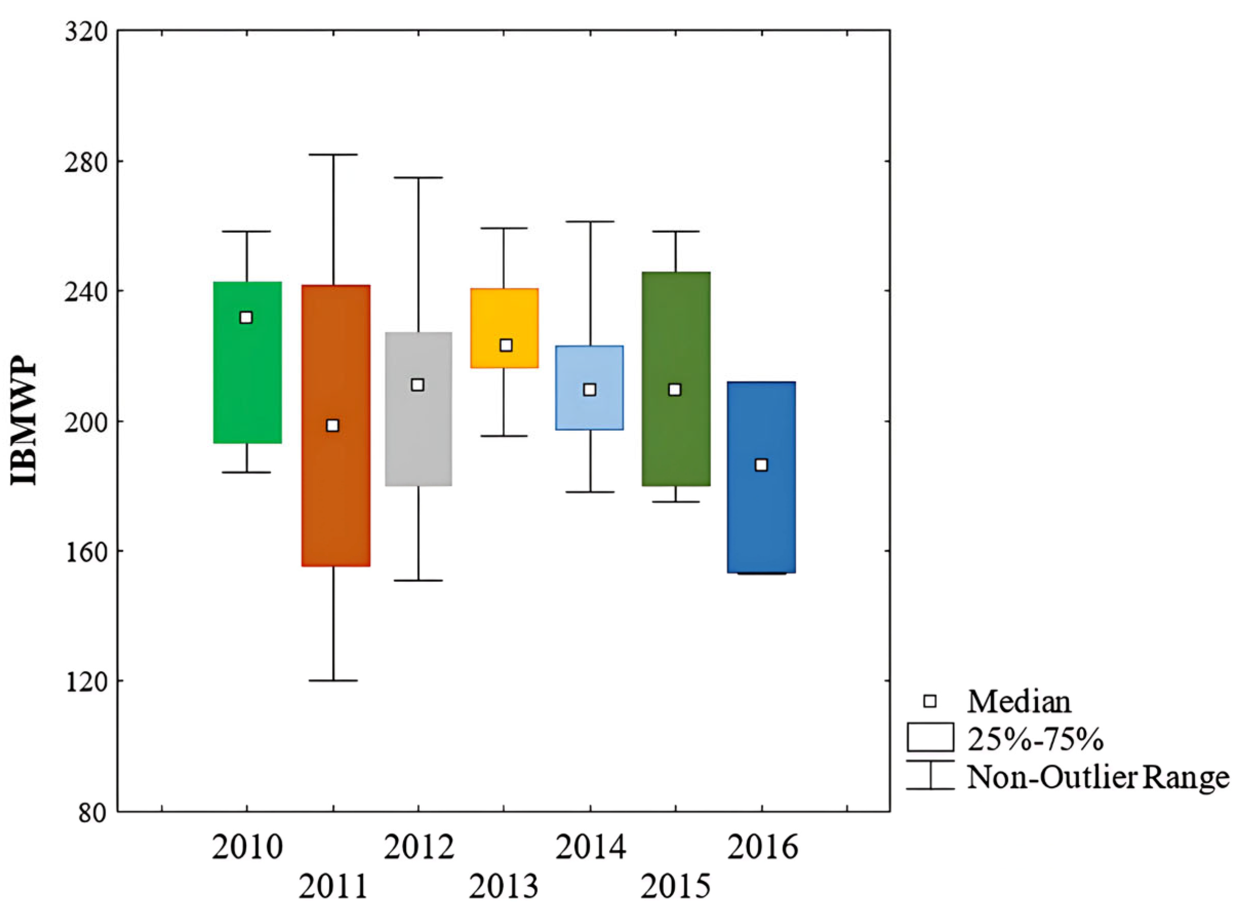 2.2.1. Water Quality Assessment Using Benthic Macroinvertebrate Assemblages