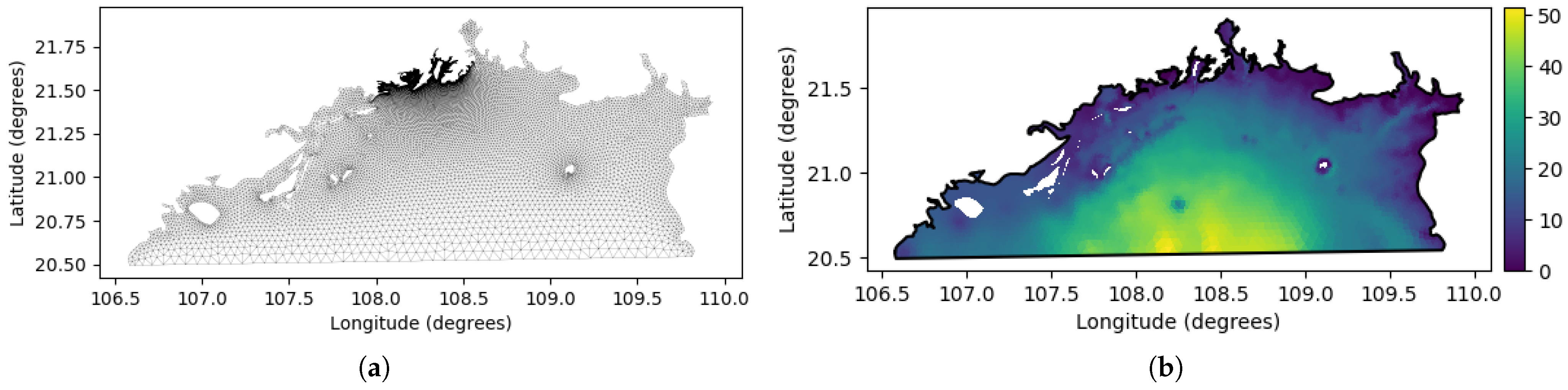 Numerical simulations were conducted using an unstructured mesh spanning 106.5° E–110° E longitude and 20.4° N–22° N latitude. The computational domain consisted of 22,543 grid cells, 12,185 nodes and 53 open-boundary nodes. A four-layer  coordinate system was vertically configured. The model incorporated wet–dry grid detection, cold-start initialization, Smagorinsky parametrization for horizontal eddy viscosity and the Mellor–Yamada 2.5-order turbulence closure model for vertical eddy viscosity.