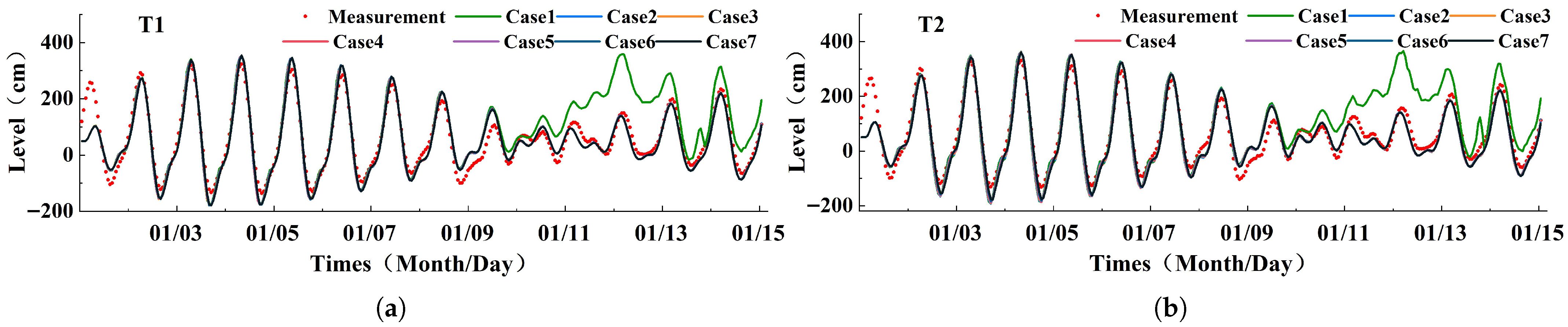 values for Cases 2–7 all exceed 0.9. This demonstrates that Cases 2–7 achieve superior simulation accuracy in reproducing observed tidal fluctuations, with enhanced congruence to measurement data.