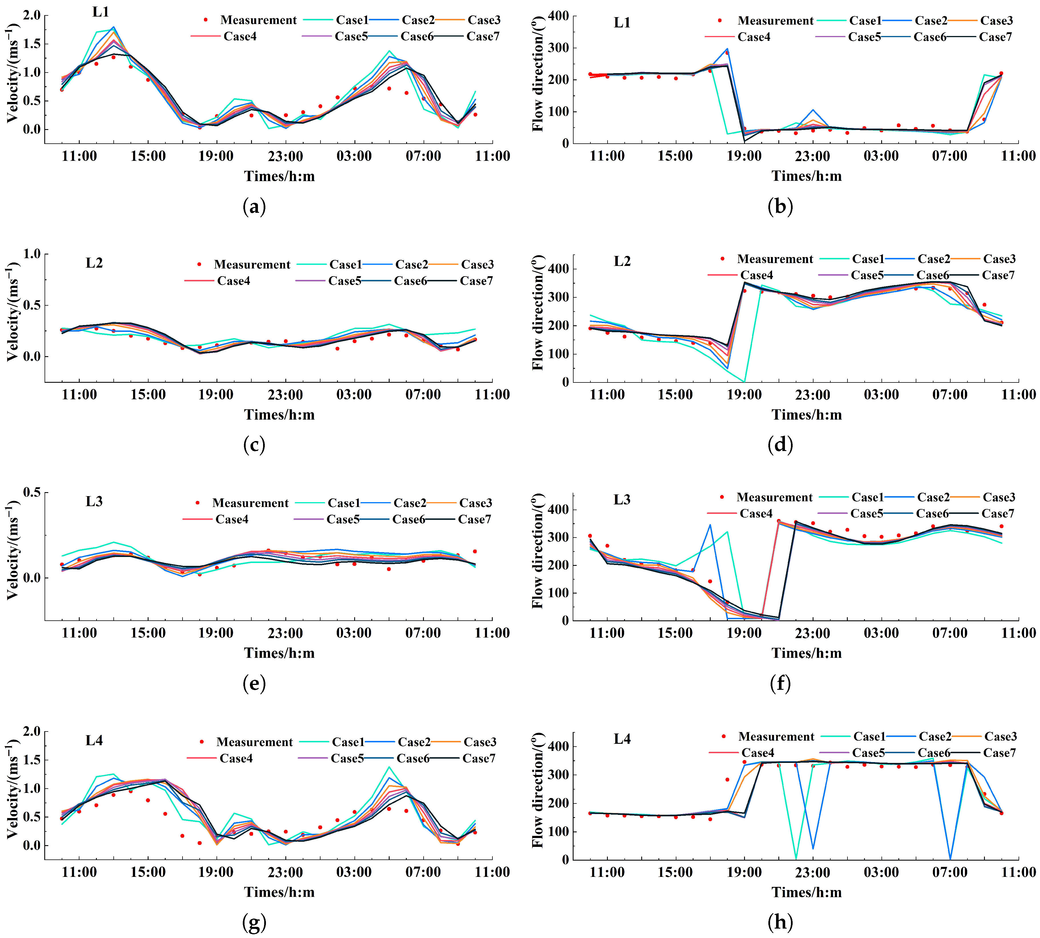 Figure 7, significant differences exist between simulated and measured current directions at tidal stations under Case 1, specifically illustrated in subplots (b), (d), (f) and (h). For all other operational cases, both simulated current velocities and directions agree well with measurement data.