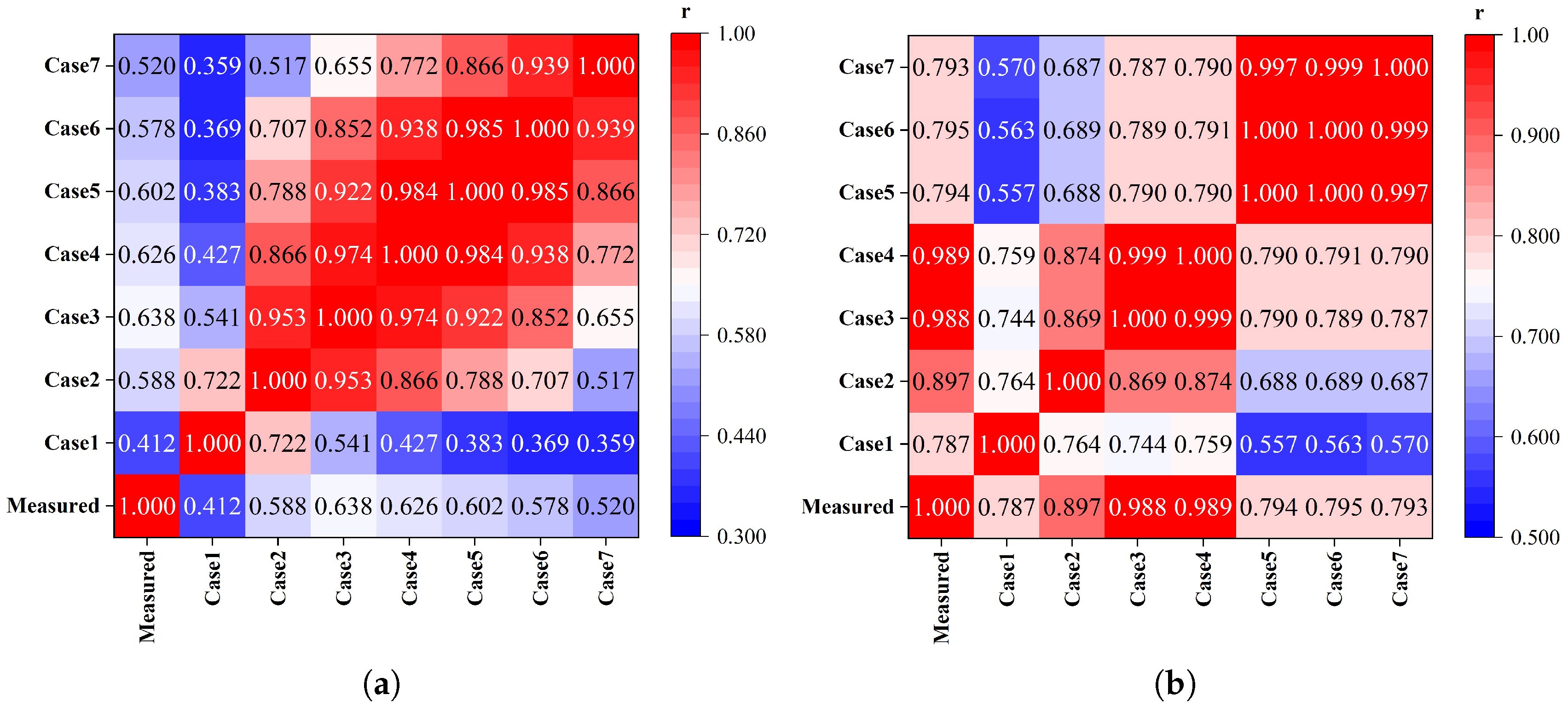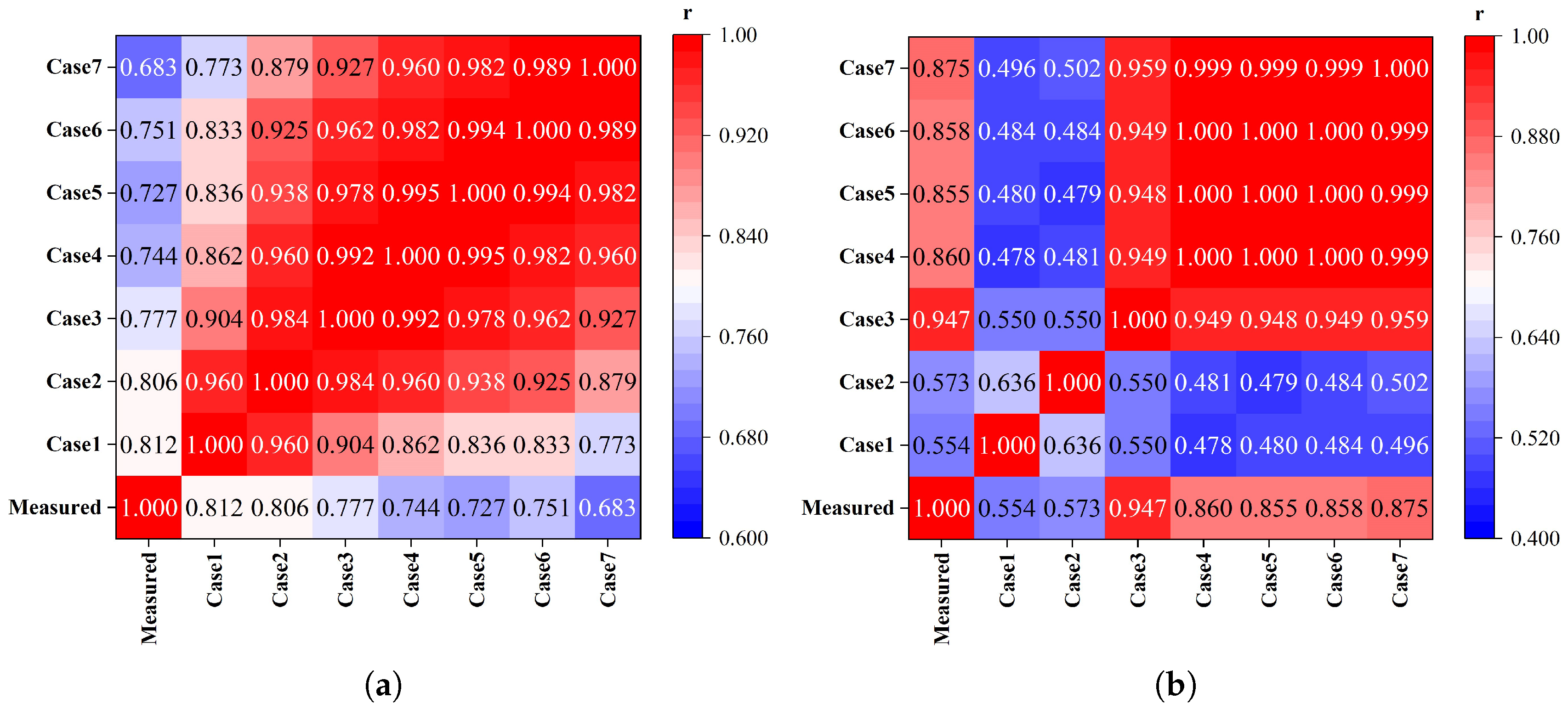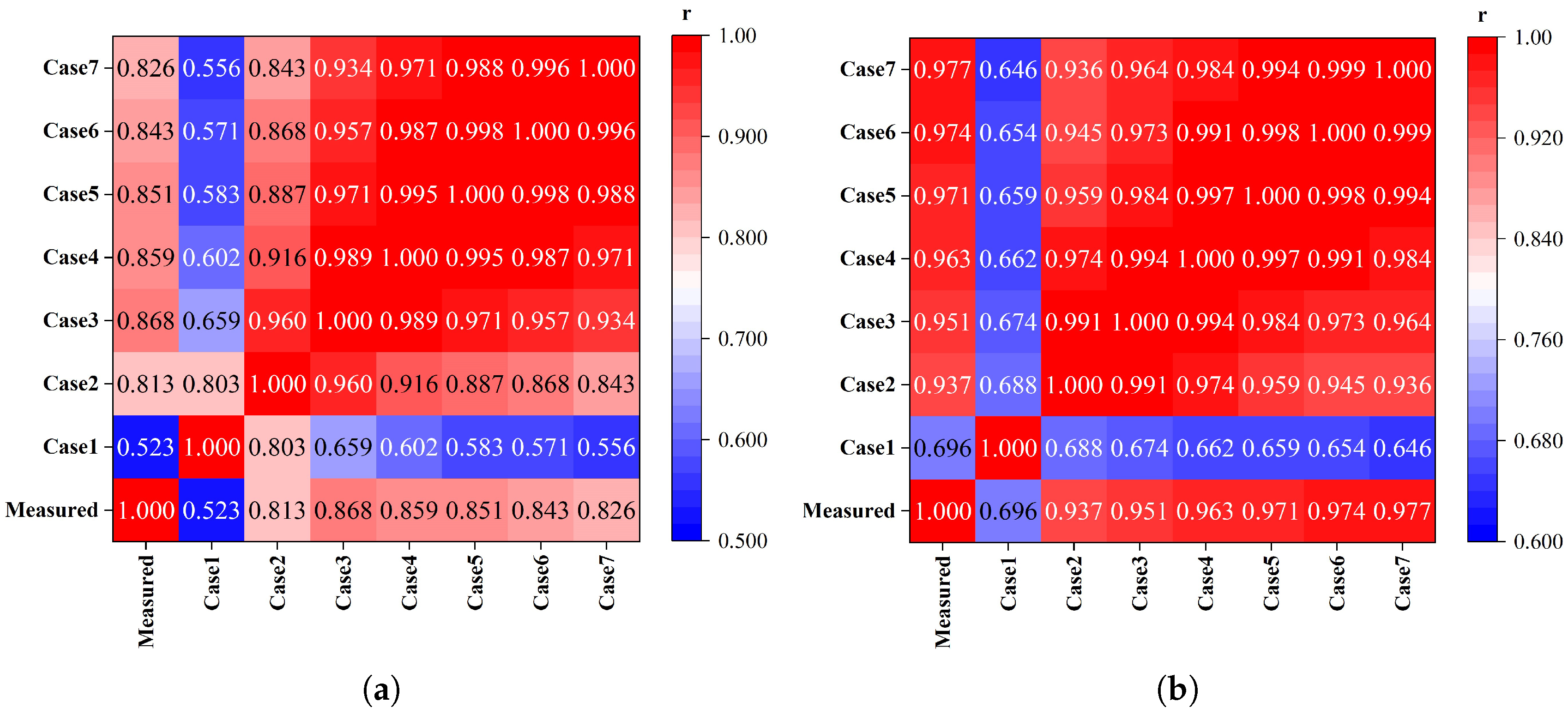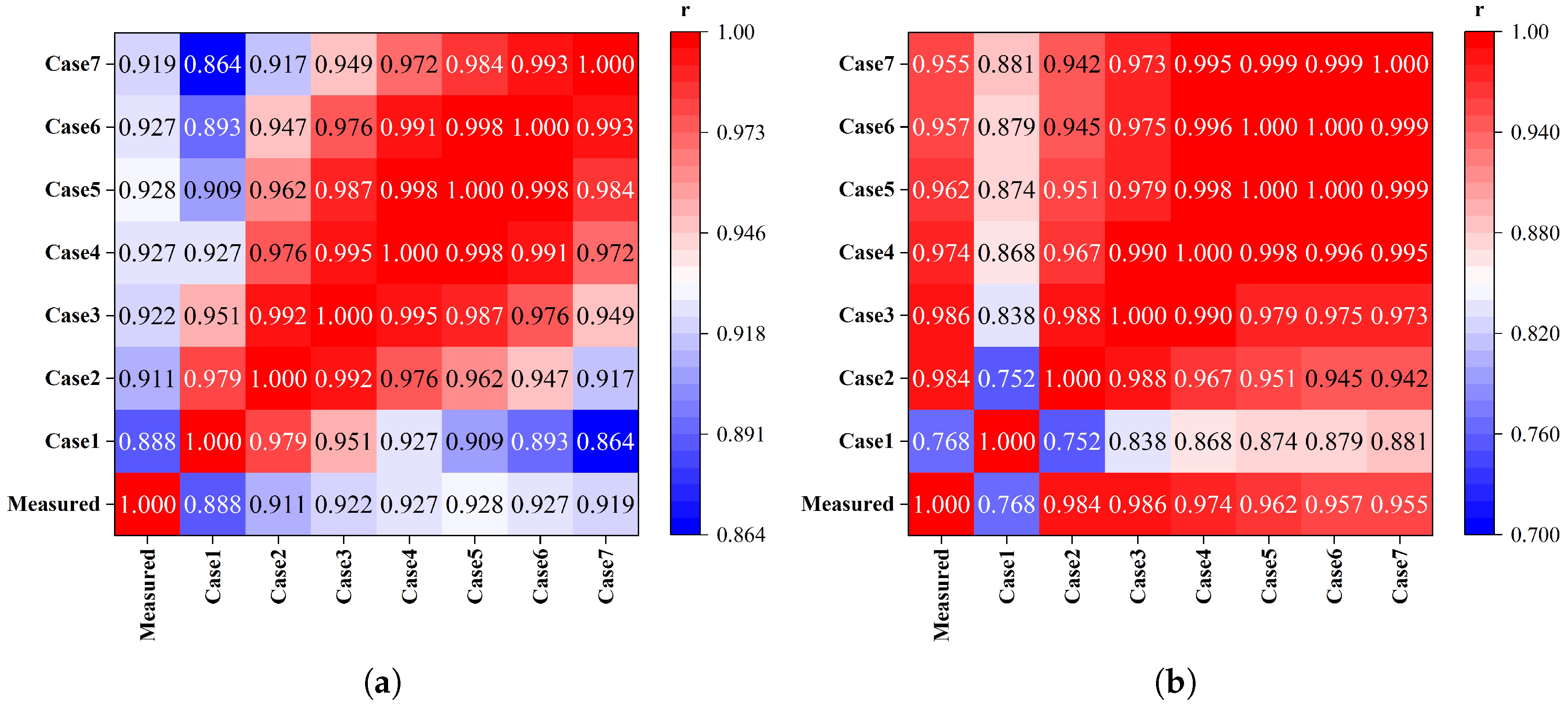 To further assess the similarity between measured data and simulation results, this study employed the Pearson correlation coefficient