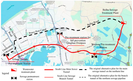 Wuhan, a megacity located in the Yangtze River Basin, is characterized by low-lying terrain and a dense water network [1]. During the rainy season, urban waterlogging occurs frequently, and traditional drainage systems are often unable to cope with extreme weather events [2]. With the acceleration of urbanization, these systems are facing increasing challenges [3]. In the urban core, wastewater treatment plants are constrained by multiple issues, including conflicts between land demand and urban development, the urgent need to improve ambient water quality, insufficient sanitary protection distances, the necessity of upgrading and expanding treatment facilities under limited land availability, and incomplete supporting sewer networks [4]. As the shallow underground space has already been saturated, it is necessary to extend development into deeper strata (below 30 m) to achieve combined sewer separation and enhance flood control and drainage capacity [5]. Deep tunnel drainage technology, as an innovative solution, offers significant advantages in optimizing sewage storage and conveyance, improving drainage efficiency, and mitigating combined sewer overflows [6].