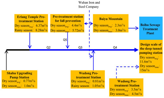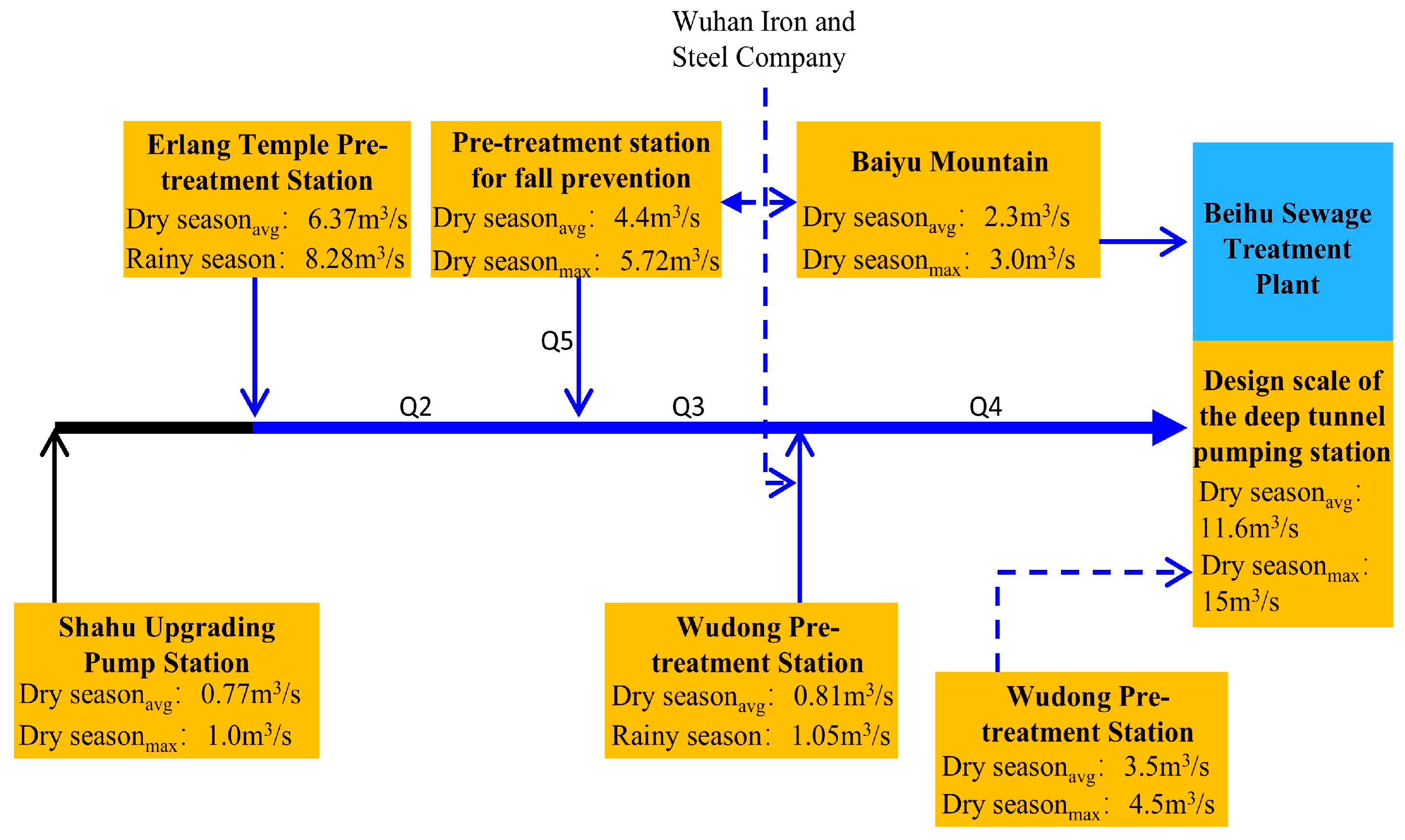 (4) Wudong Pretreatment Station: dry-season capacity covers the Wudong area (south of Qinghua Road) and part of the future Wugang inflow; rainy-season capacity includes dry-season capacity and one additional unit (n0 + 1);