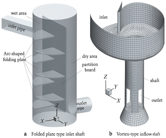 Vortex shafts have an inlet similar to that of a swirl grit chamber, causing water to spiral downward along the shaft walls under centrifugal force; energy dissipation occurs mainly through friction and water drops [31]. Baffle-type shafts feature multiple staggered horizontal baffles, dividing the shaft vertically into a series of drop sections, with energy dissipation achieved through sequential drops. As shown in Figure 6, both vortex and baffle shafts have relatively simple structures. To scientifically select the inflow shaft type, a three-dimensional model of the shaft was established using the realizable k-ε two-phase gas–liquid turbulence model. The governing equations were discretized using the control volume method, and velocity–pressure coupling was handled via the SIMPLER algorithm. A flow boundary was applied at the upstream open channel entrance, and a pressure boundary was applied at the outlet. Accordingly, three-dimensional models of vortex-type (Figure 7) and baffle-type inflow shafts (Figure 8) were established, and then the distribution of water phase volume fraction inside the tunnel was, respectively, simulated.