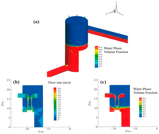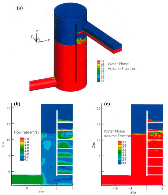 (a) Three-dimensional Model of Baffle Inflow Shaft and the Distribution Modeling of Water Phase Volume Fraction inside the Tunnel; the simulated Longitudinal Section Distribution of Velocity (b,c) Water Phase Volume Fraction in the Shaft.