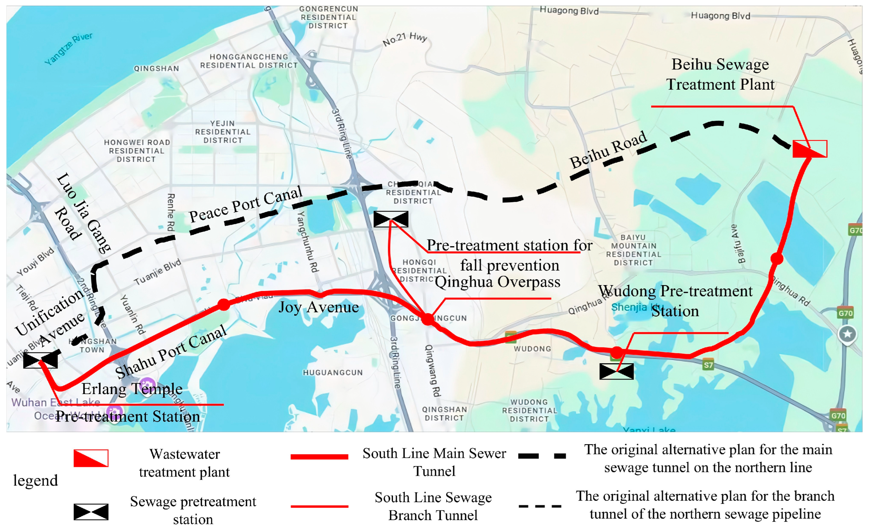 1. East Lake Core Area Deep Tunnel System: The system adopts a “main tunnel + branch tunnel” configuration, primarily designed to convey wastewater from the Wuchang district to the Beihu Wastewater Treatment Plant for centralized treatment. It includes: (1) The Main Tunnel starts from Erlangmiao Pretreatment Station and ends at Beihu WWTP. The main tunnel is laid in the deep underground space of Wuchang, Hongshan, and Qingshan districts, passing through areas previously served by Shahu, Erlangmiao, and Luobuzui treatment plants. The total length is approximately 17.5 km, constructed using the shield tunneling method, with an inner diameter of 3.0–3.4 m, burial depth of 30–42 m, and slope of 0.00065 (≈0.065%). (2) Branch Tunnel, which connects to the main tunnel at the Qinghua Interchange Node from the Luobuzui Pretreatment Station. It is approximately 1.7 km long, constructed using the jacking method, with an inner diameter of 1.5 m, burial depth of 20–21 m, and slope of 0.0005 (≈0.05%).