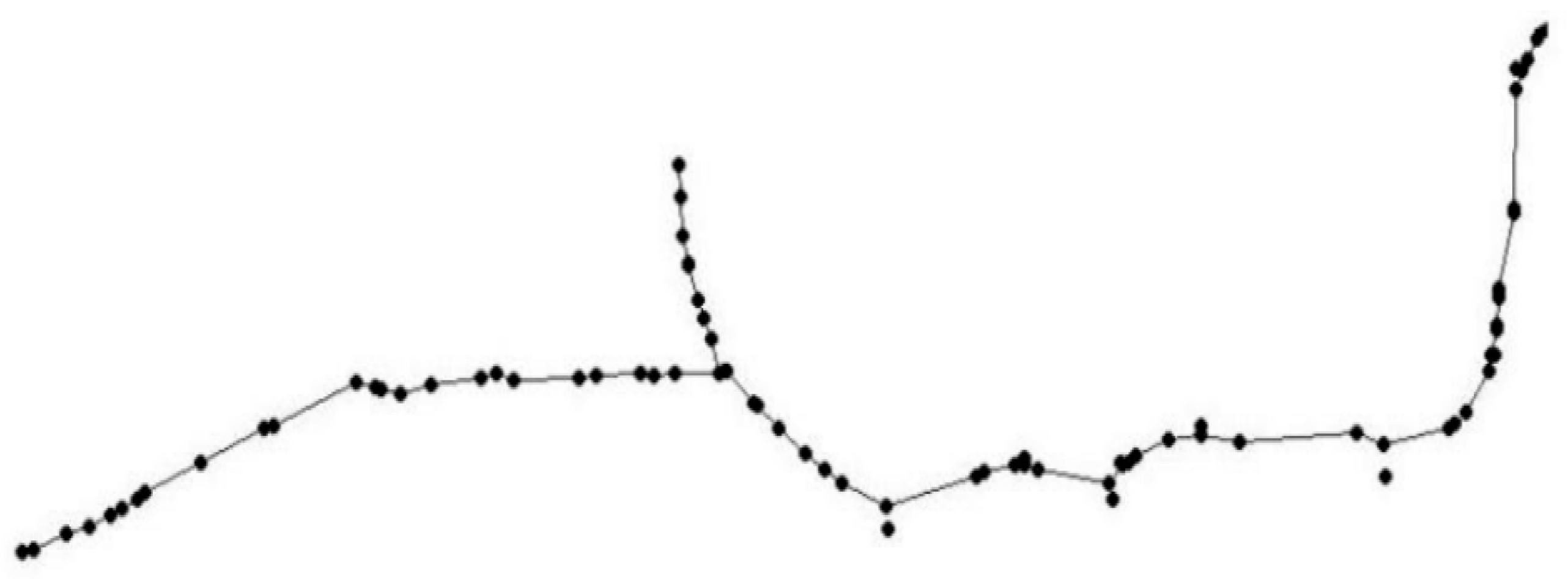 Based on the overall SWMM calculations, a hydraulic model of the East Lake deep tunnel was established. In this model, the deep tunnel was idealized as a large-diameter conduit with a uniform slope, with a total length of 19.2 km. The model was constructed using pipeline node coordinates, elevations, and slope data, with Erlangmiao and Luobuzui pretreatment stations as inflow boundaries and the terminal pumping station as the outflow boundary. The pipeline Manning coefficient was set to 0.014, and the time step was 5 s. The hydraulic model primarily computed flow distribution, hydraulic grade lines, and energy losses under various design conditions, enabling the assessment of conveyance capacity under extreme rainfall events and verification of operational safety. Figure 2 illustrates the simplified hydraulic model of the East Lake tunnel.