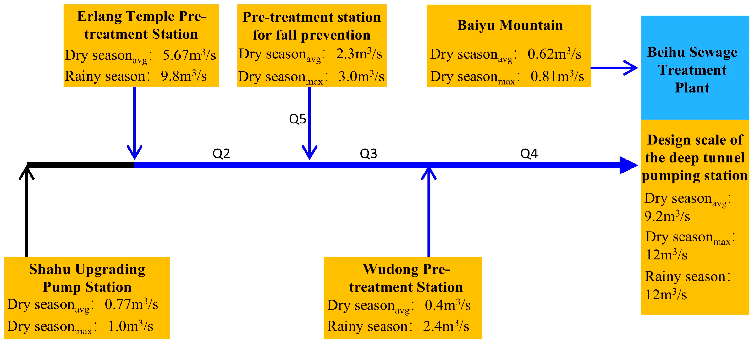 (2) Erlangmiao Pretreatment Station: dry-season capacity includes the combined scales of the Shahu and Erlangmiao sewage collection systems, and near-term rainy-season capacity equals the sum of its dry-season capacity and the rainy-season inflow