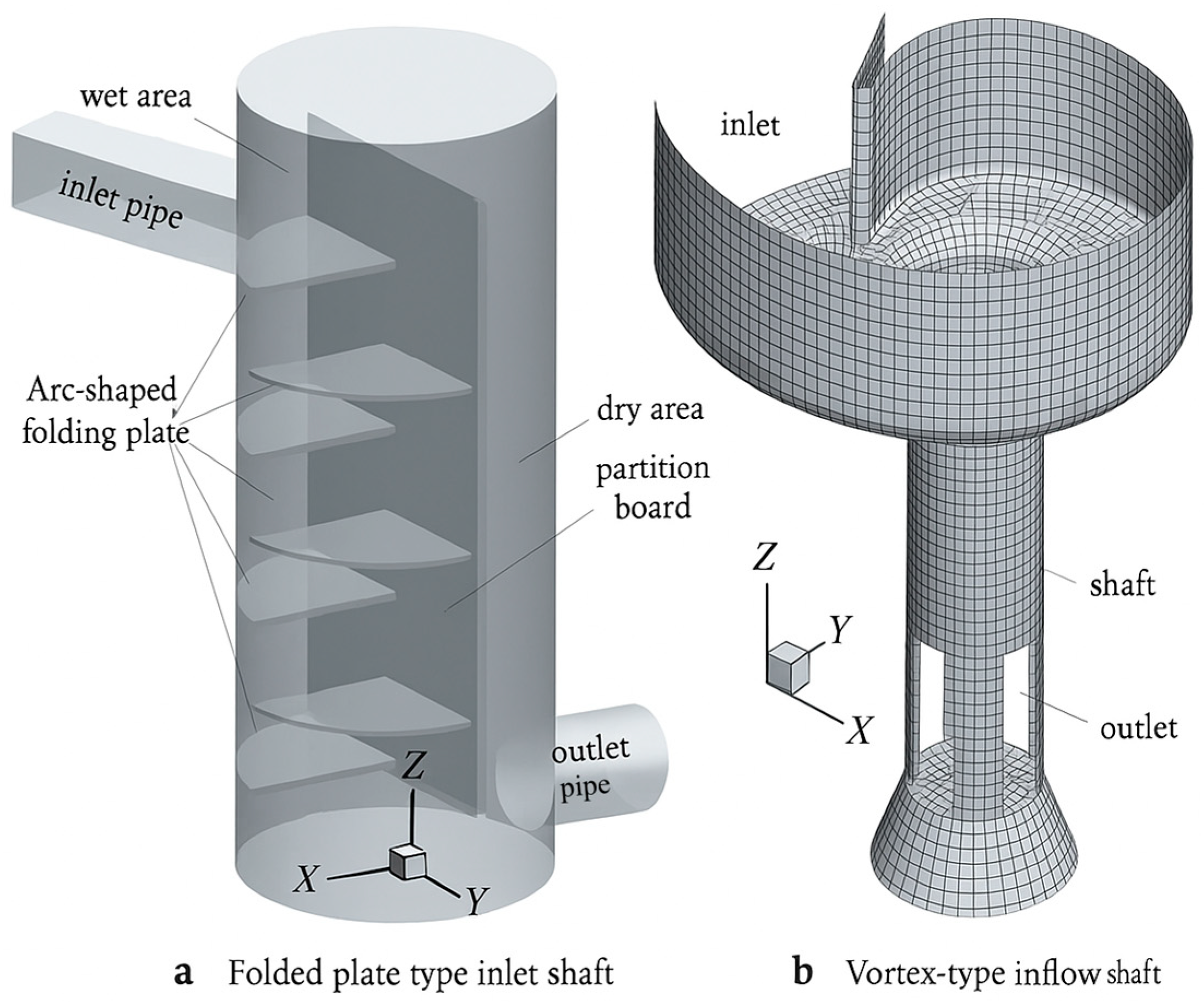Structure of Typical Inflow Shaft Used for Deep Tunnel: (a) Baffle-type inlet shaft; (b) Vortex-type inflow shaft.