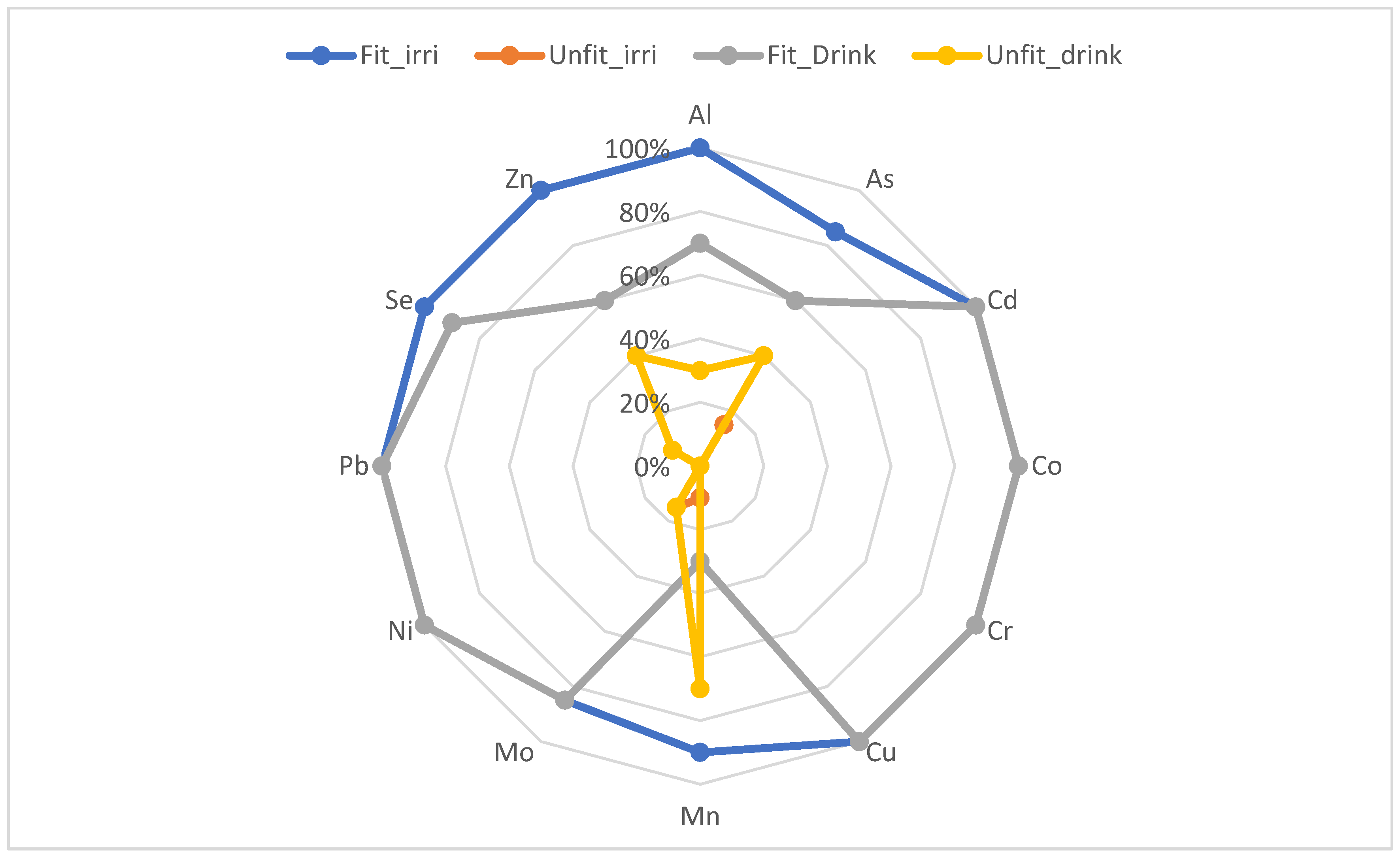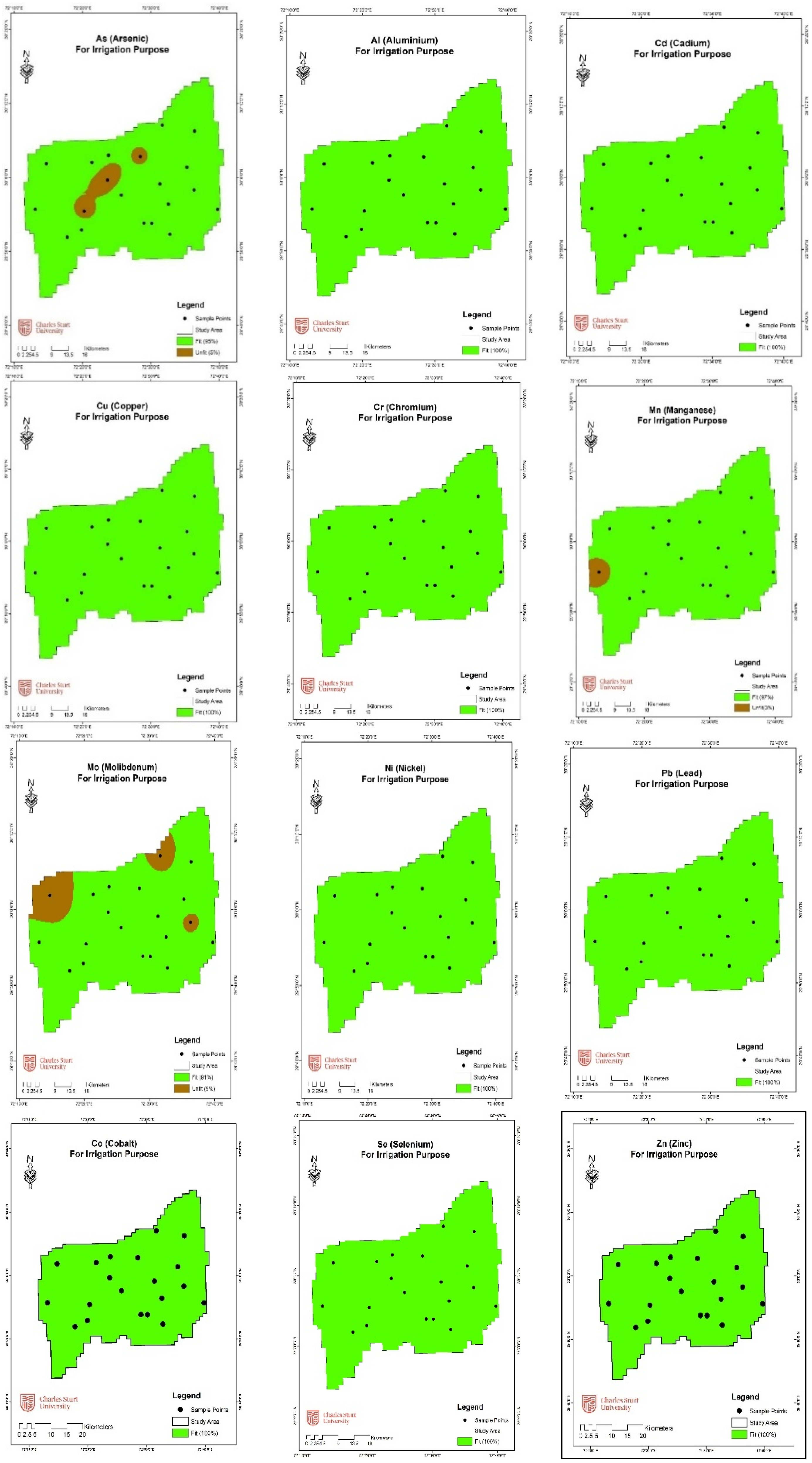 | Name of Heavy Metal | Maximum Permissible Limits for Irrigation Water (ppb) [74] | Fit | Unfit | ||