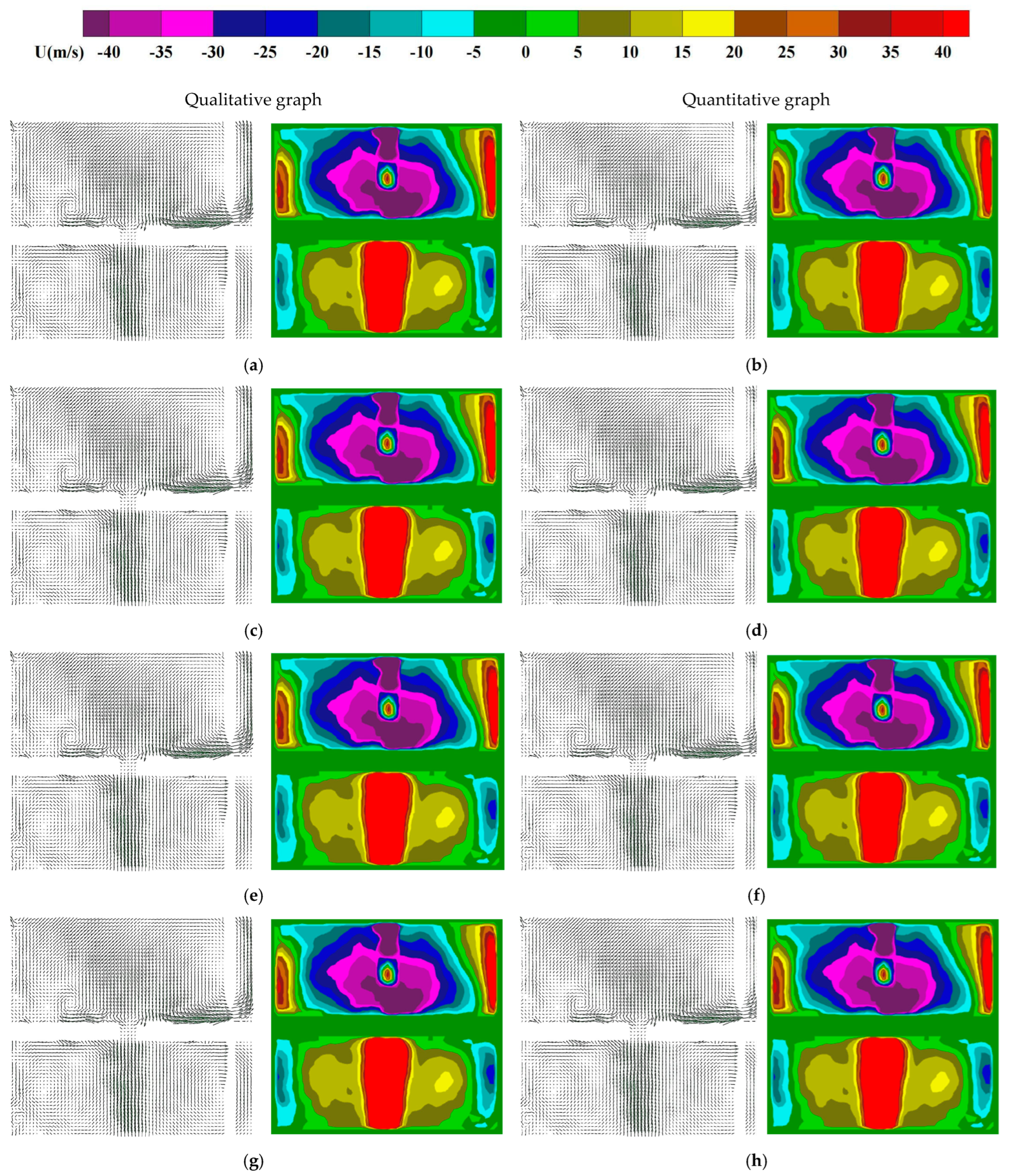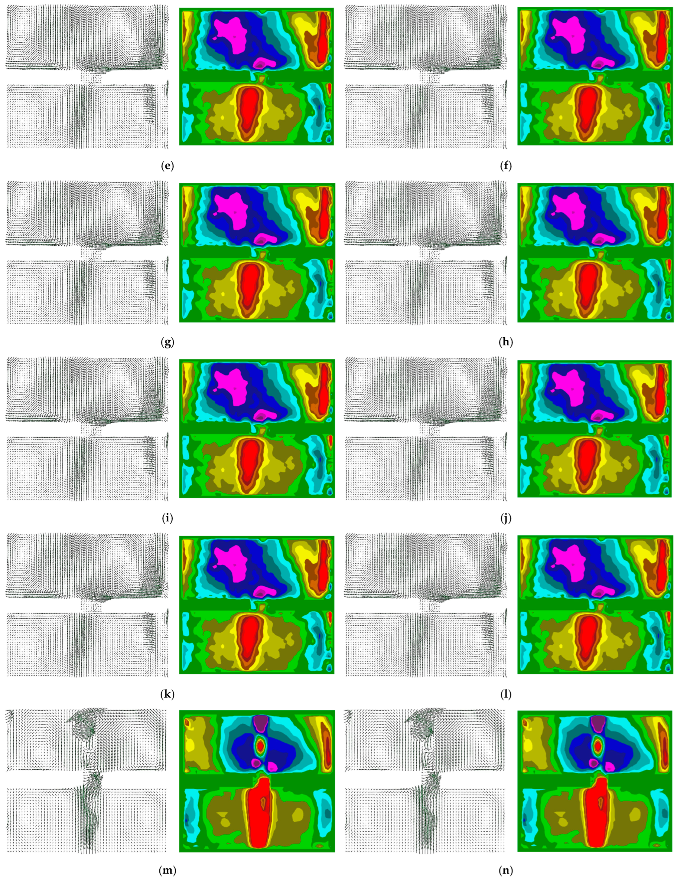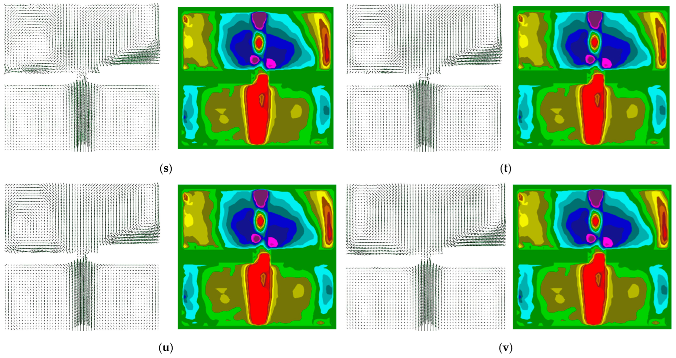 - At constant pressure, an increase in flow rate leads to an expansion in vortex volume and higher energy consumption due to intensified vortex activity. This results in greater pressure loss and reduced overall efficiency. The elevated flow rate also introduces a left–right pressure differential, altering local velocities and destabilizing the flow distribution, which promotes the formation of additional small-scale vortices. Under varying flow rates, the behavior of the standard diaphragm becomes more complex. Vortices become increasingly unstable and prone to breakdown under different pressure conditions, ultimately reducing the system’s dynamic response speed.