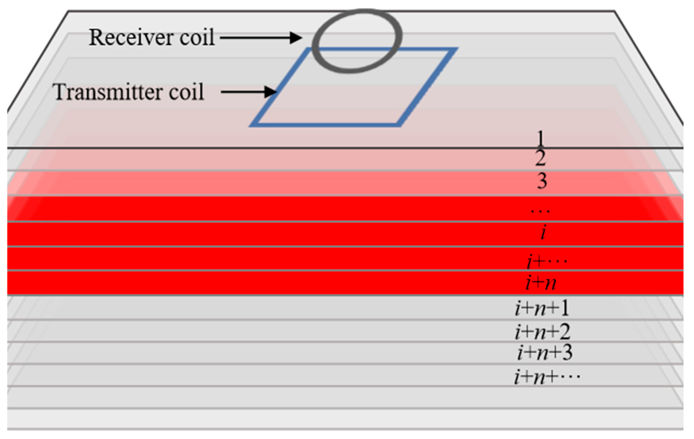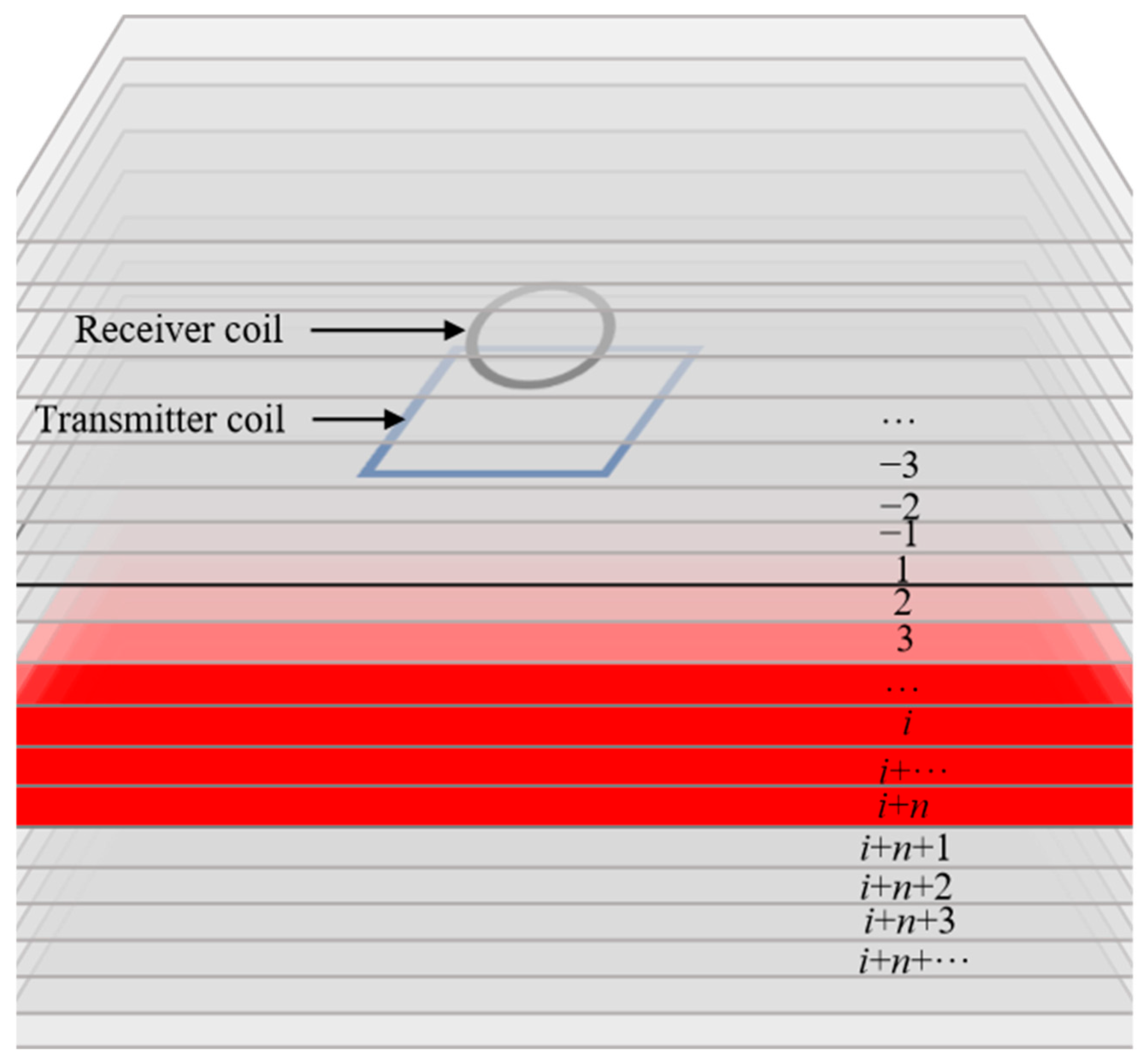 n constitute the low-resistivity anomalous body. Under this discretization scheme, the TEM response received by the coil is approximated as the superposition of signals generated by the infinite horizontal eddy currents induced within each of these thin layers throughout the medium.