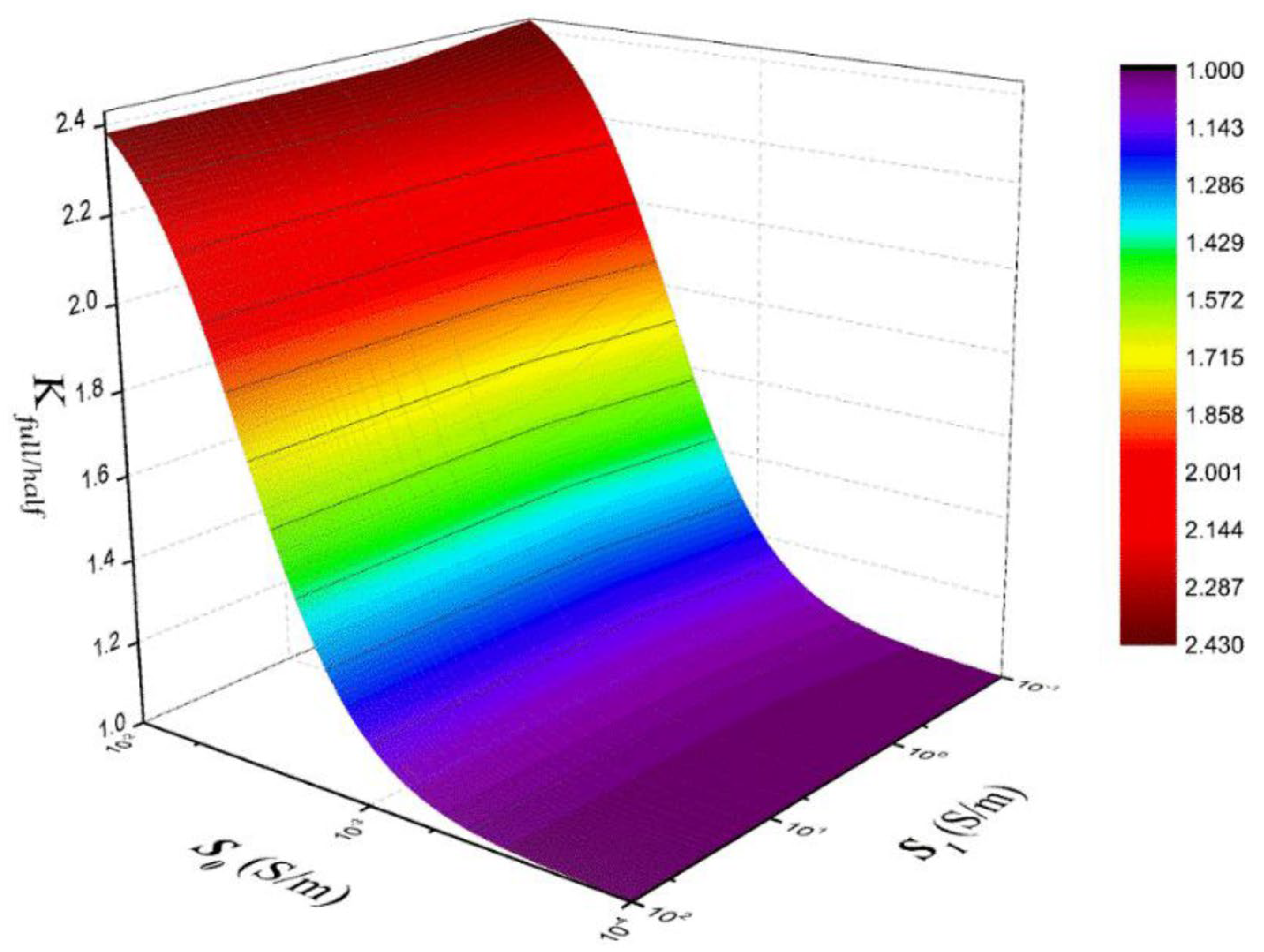 11] concluded that the apparent resistivity inverted from full-space TEM responses ranges from 0.67 to 2.5 times that derived from half-space responses through comparative analysis of analytical formulas and measured data. When a large conductive anomaly dominates the response, the ratio coefficient approaches 0.67. However, the ratio coefficient is close to 2.5 for a nearly homogeneous medium. Liang et al. [