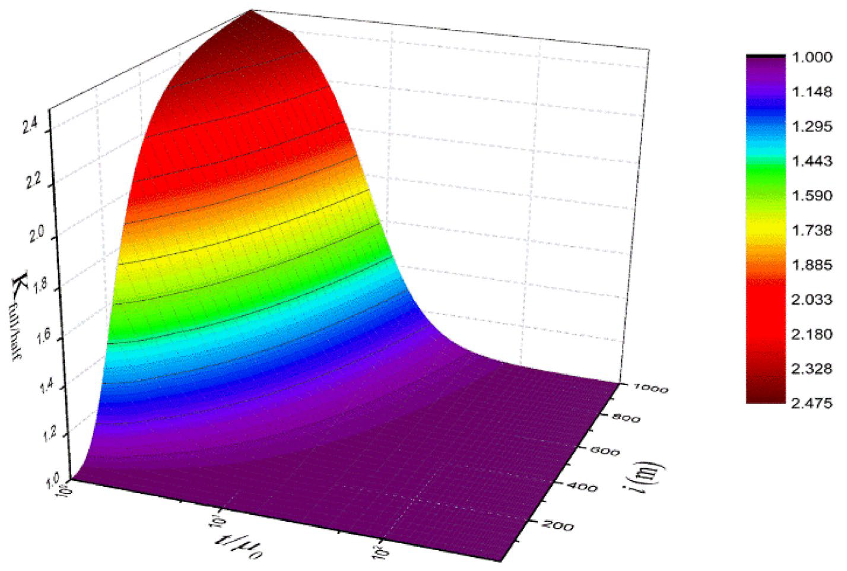 Figure 9. Under the same conditions of rock medium and electrical parameters of the anomalous body, the ratio coefficients of the transient electromagnetic response in the full-space and half-space were calculated. The results are shown in