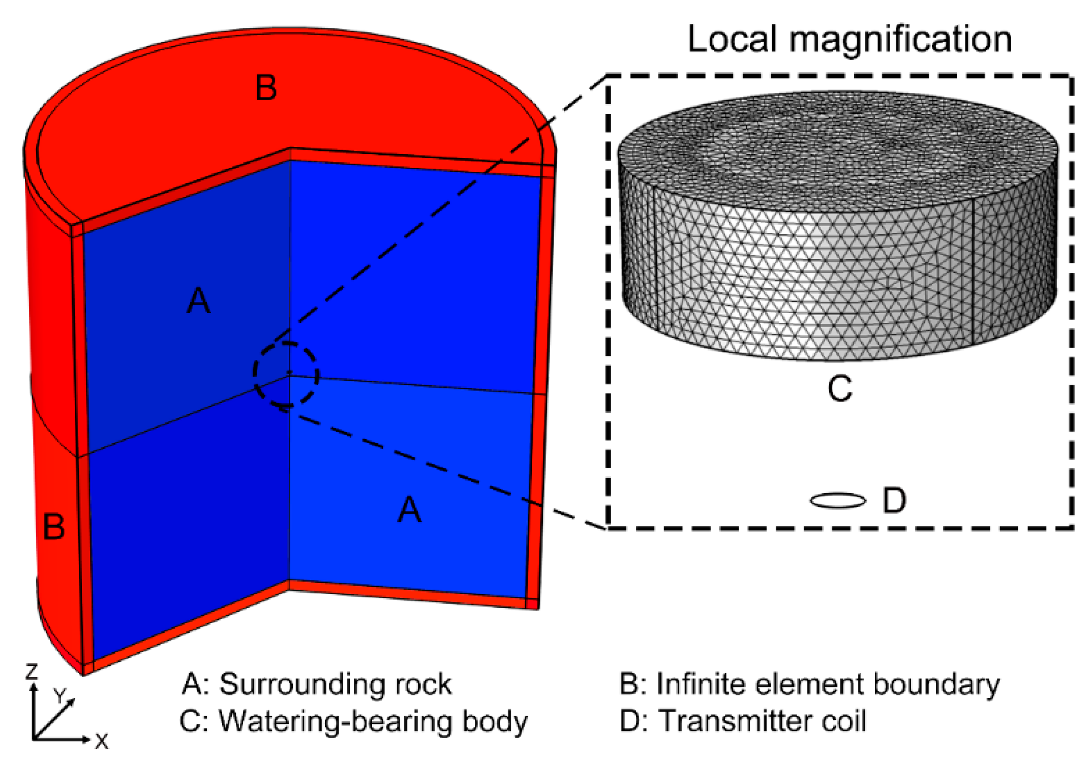 7]. When employing TEMs for detection in tunnel roadways, the detection coil is surrounded by rock formations over a significant portion of its forward and rearward regions. Consequently, the surrounding environment closely approximates full-space conditions. Relying solely on half-space theory for inversion and interpretation inevitably introduces errors, resulting in inaccuracies in the outcomes of TEM-based advanced detection [