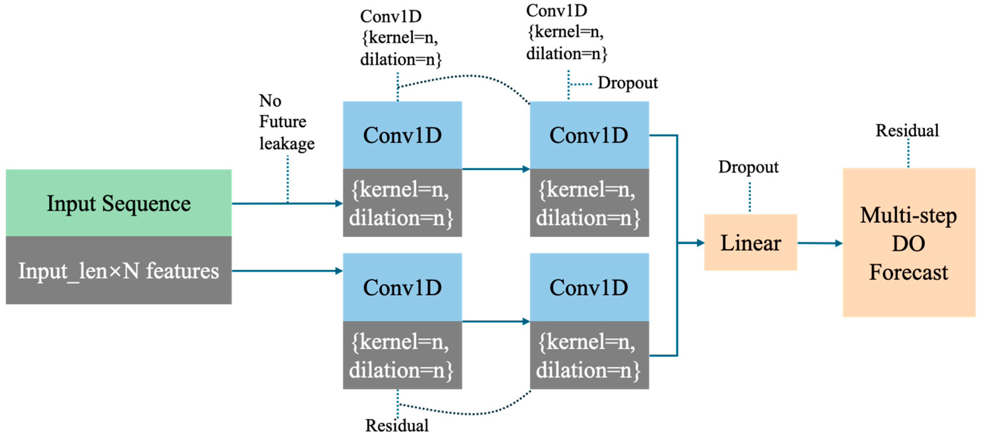 | Deep Learning | TCN | Dilated causal 1D convolutions with residual/skip connections | input_length = 144, output_length = 24, kernel_size = 5, num_filters = 5, dilation = 2, dropout = 0.1 |