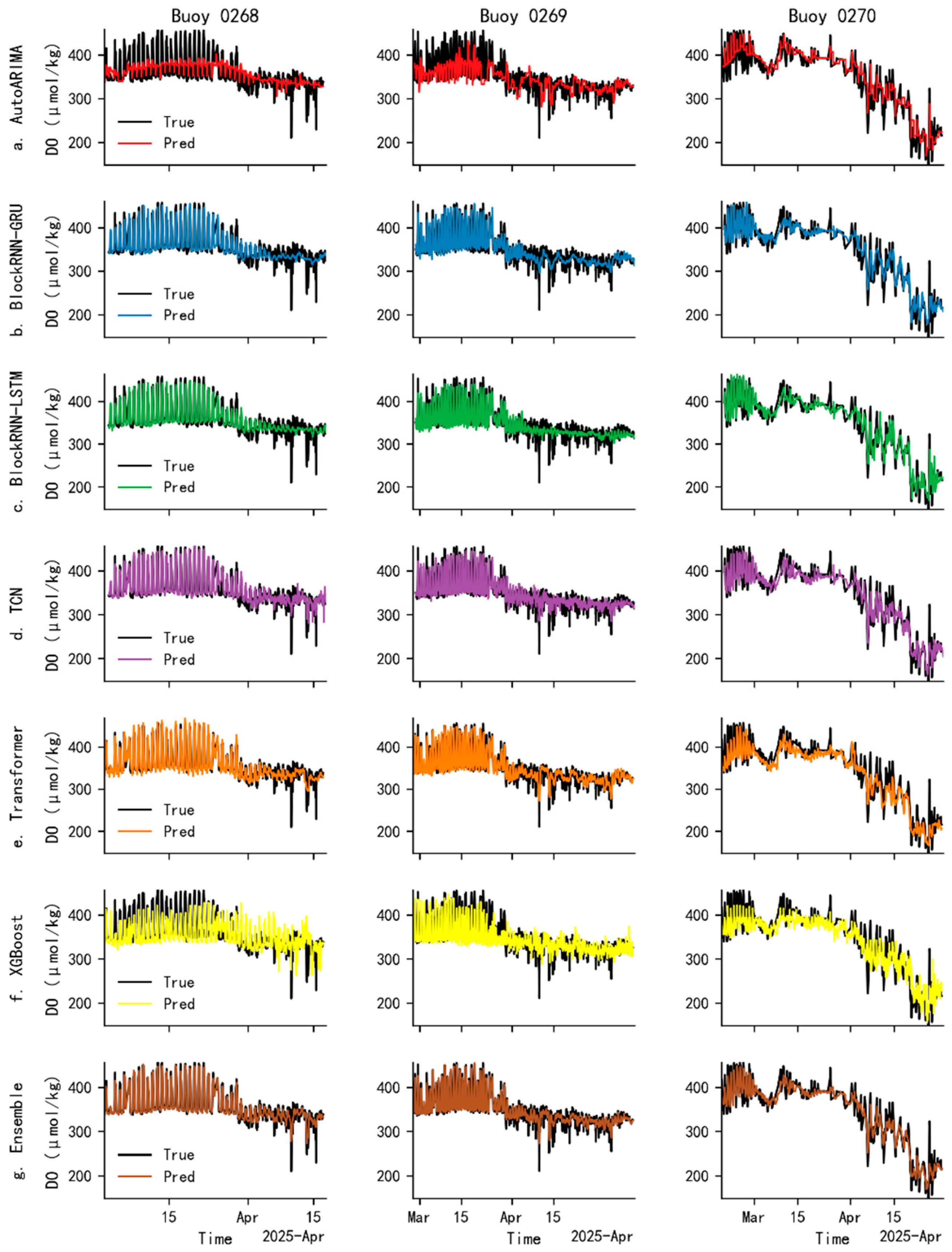 - Liang, W.; Liu, T.; Wang, Y.; Jiao, J.J.; Gan, J.; He, D. Spatiotemporal-Aware Machine Learning Approaches for Dissolved Oxygen Prediction in Coastal Waters. Sci. Total Environ. 2023, 905, 167138. [Google Scholar] [CrossRef]