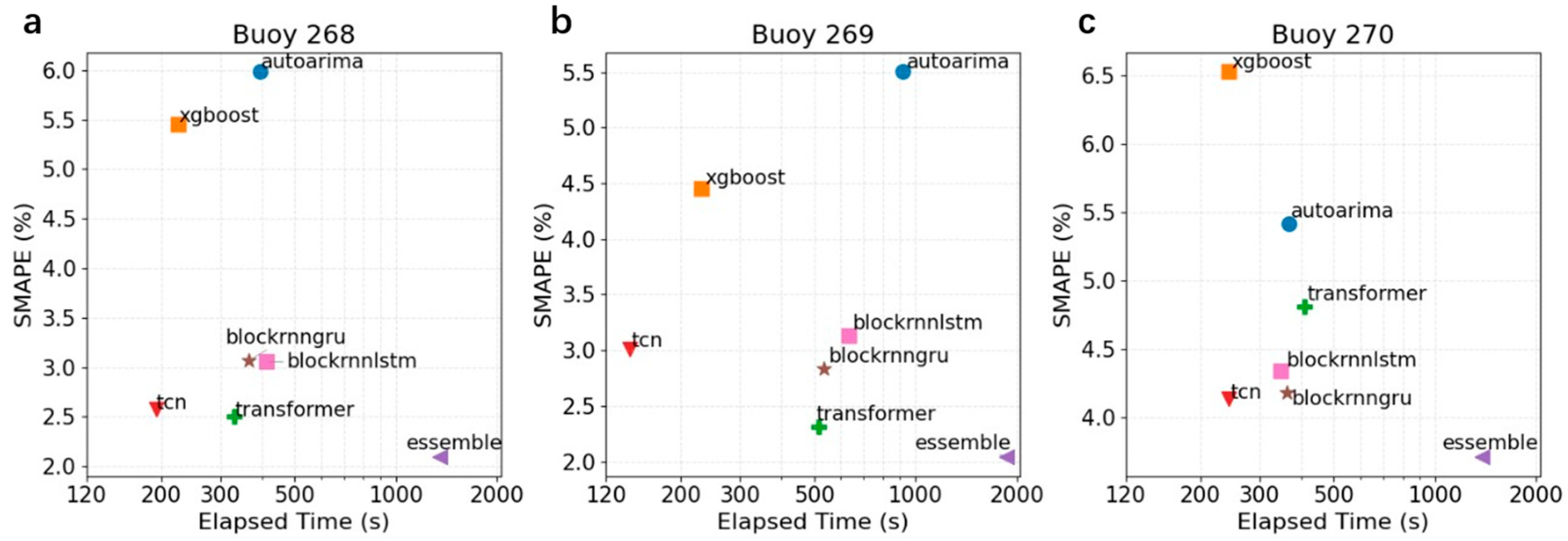 5.3. Comparison of Model Accuracy and Computational Efficiency for Each Buoy