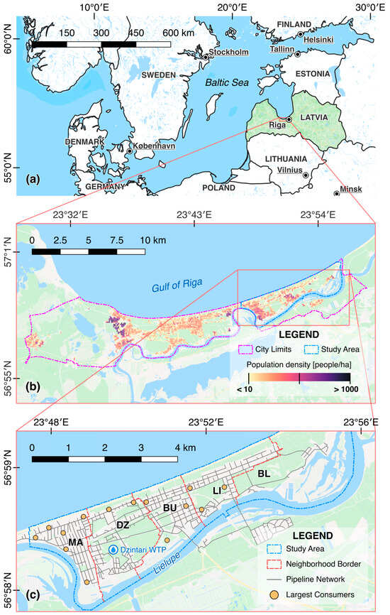 (a) Location of Jūrmala within the Baltic region. (b) Population density distribution across Jūrmala and the boundaries of the study area. (c) Neighborhood delineation within the study area, including the distribution pipeline network and the largest water consumers.