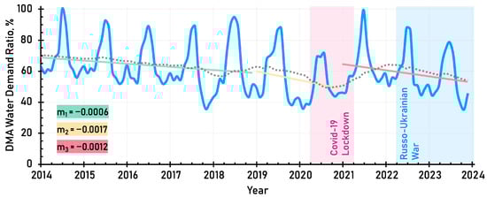 Normalized monthly water supply fluctuations to the Dzintari DMA (2014–2024). The solid blue line represents the monthly volume of water supplied to the Dzintari DMA over the past decade, normalized to a peak value of 100% (observed in July 2014 at 111,243 m3). The dashed gray line shows a 12-month moving average, highlighting a consistent downward trend in consumption despite an increase in the number of service connections. Linear regression trends are shown for three distinct periods: pre-, during, and post-COVID (green, yellow, and red, respectively), with the pink shaded area marking the nationwide lockdown period. Although demand temporarily surged following the lifting of restrictions, the rate of decline in consumption has remained accelerated twofold in the post-pandemic period—partially attributed to the imposed sanctions related to the Russo-Ukrainian war (blue shaded area).