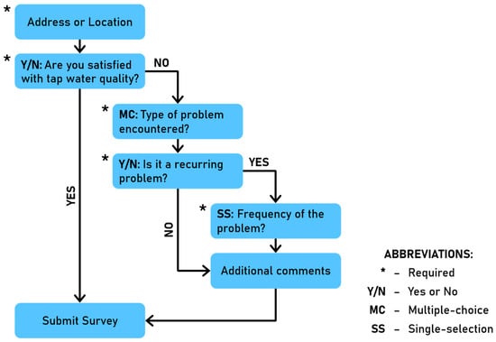 To fully utilize end-user abilities to sense variations in supplied water characteristics, a data funnel in the form of an online questionnaire was developed for the purposes of this study. During the conceptualization of the survey, specific criteria were established to guide its design and functionality. The survey was crafted to: (1) identify the presence of a problem, (2) add spatial context to submissions and pinpoint reported issues, (3) detect data trends and localize problem hotspots, and (4) assess the effectiveness of remedial actions taken. A flowchart detailing the structure of the survey is provided in Figure 4.