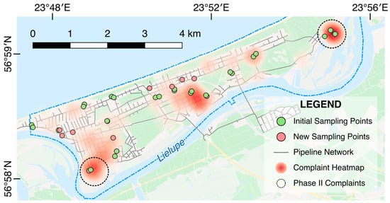 Analysis of the initial feedback data indicates that negative feedback, regardless of the city area, tends to cluster into hotspots and the problems reported within a certain hotspot are of similar nature. Figure 5 shows the hotspots for the Dzintari DMA after the first response phase (prior to any interventions by the utility). When cross-examining the initial configuration of monitoring locations against the identified hotspots, it is evident that prior monitoring activities were concentrated in non-problematic areas of the DMA leading to a distorted perception of the actual DWQ conditions within the WDN.