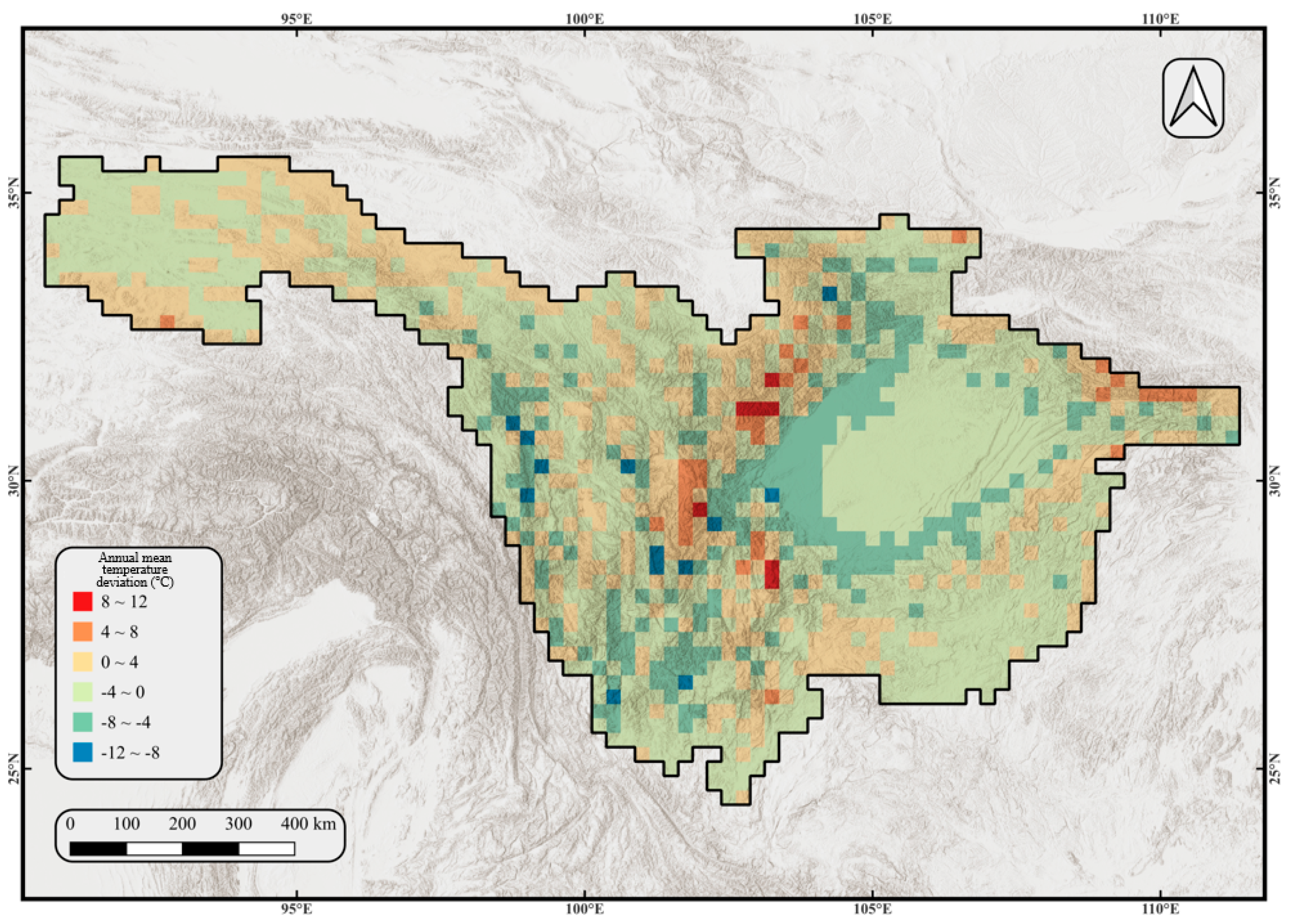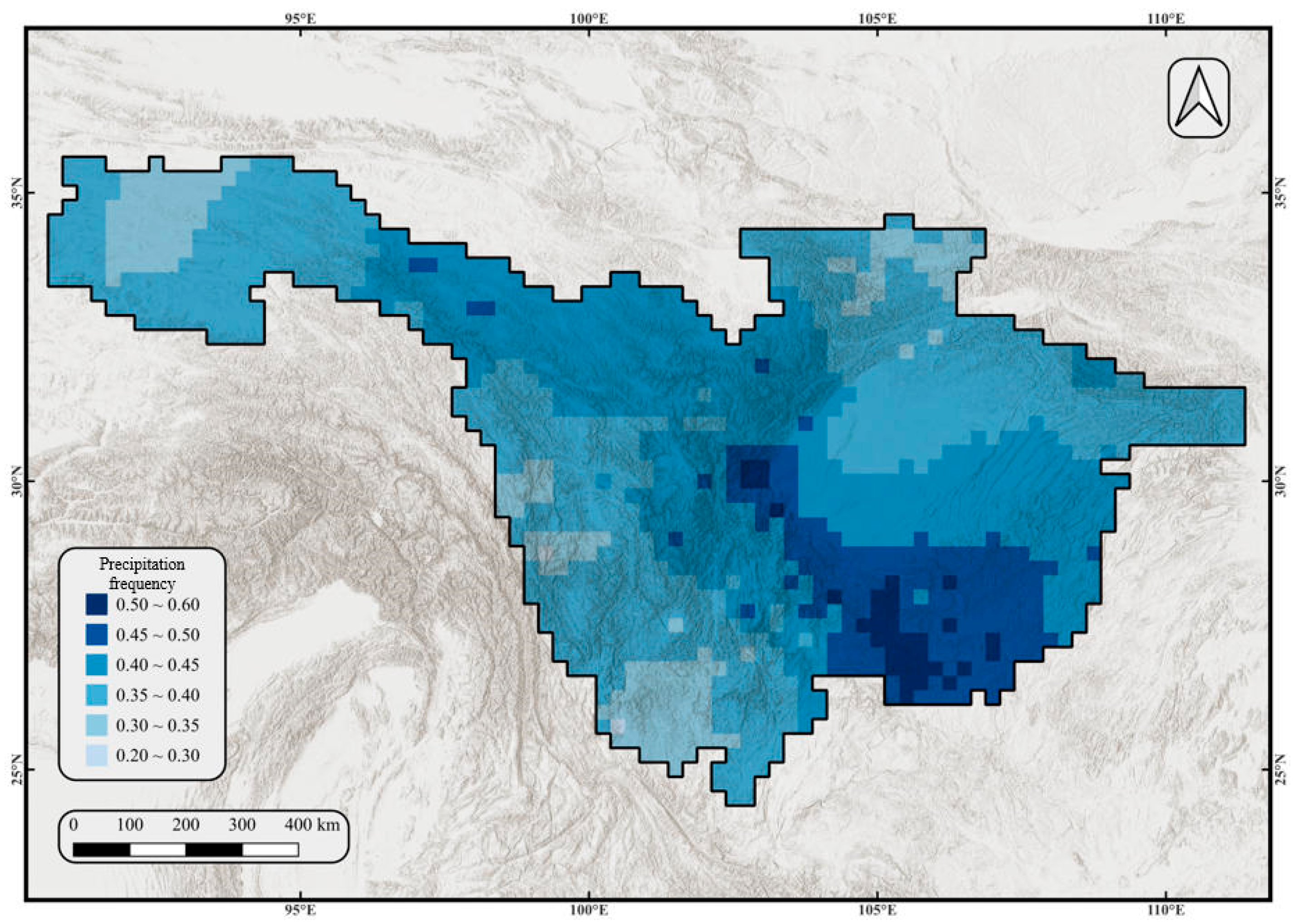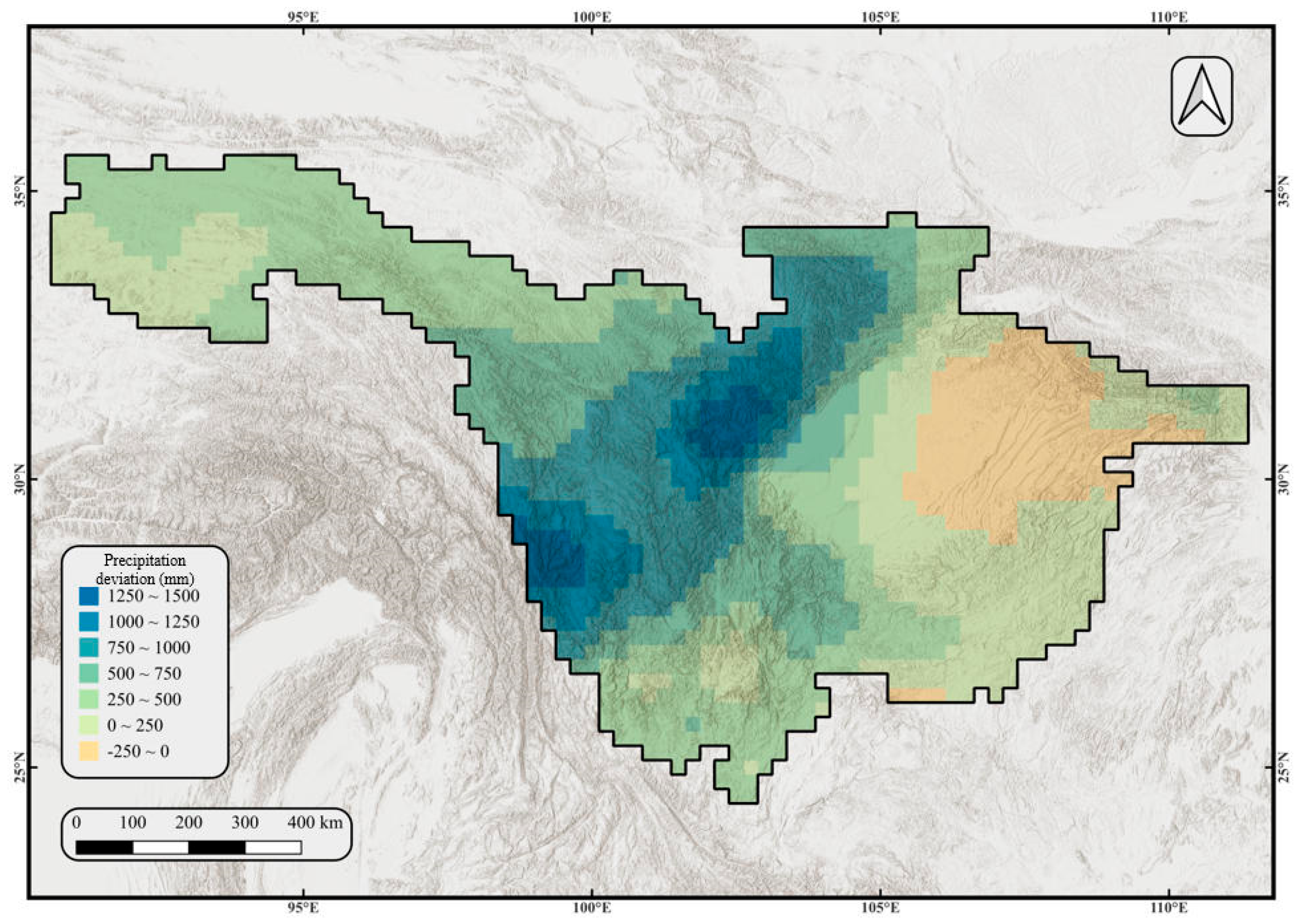 - Bias correction of CMIP6 climate data: Using CMFD reanalysis data as a reference, the historical performance (1981–2010) of multi-model ensemble simulations from four CMIP6 models was evaluated. Results revealed pronounced systematic biases in the raw data: precipitation was generally overestimated, particularly over the Hengduan Mountains, while temperature was underestimated, with deviations of 4–8 °C in the western and southern Sichuan Basin. Evaluation of CMFD data showed that while long-term precipitation patterns were generally well represented, the overall magnitude was overestimated, and precipitation frequency was significantly higher than observed. This was corrected by adjusting the rainfall threshold to align with station observations. For temperature, CMFD showed strong consistency with observations in the Sichuan Basin and low-latitude regions. In the bias correction stage, the frequency-adjusted CMFD was used as the benchmark. For precipitation, comparison between the Local Intensity Correction (LOCI) method and Daily Bias Correction (DBC) indicated that LOCI performed better overall, reducing mean absolute error from 35 mm to 10 mm and root mean square error from 40 mm to 17 mm. For temperature, the DBC method was effective, reducing mean absolute error from 1.6 °C to 0.8 °C and root mean square error from 2.0 °C to 1.0 °C. Furthermore, the corrected multi-model ensemble showed higher accuracy than individual models.