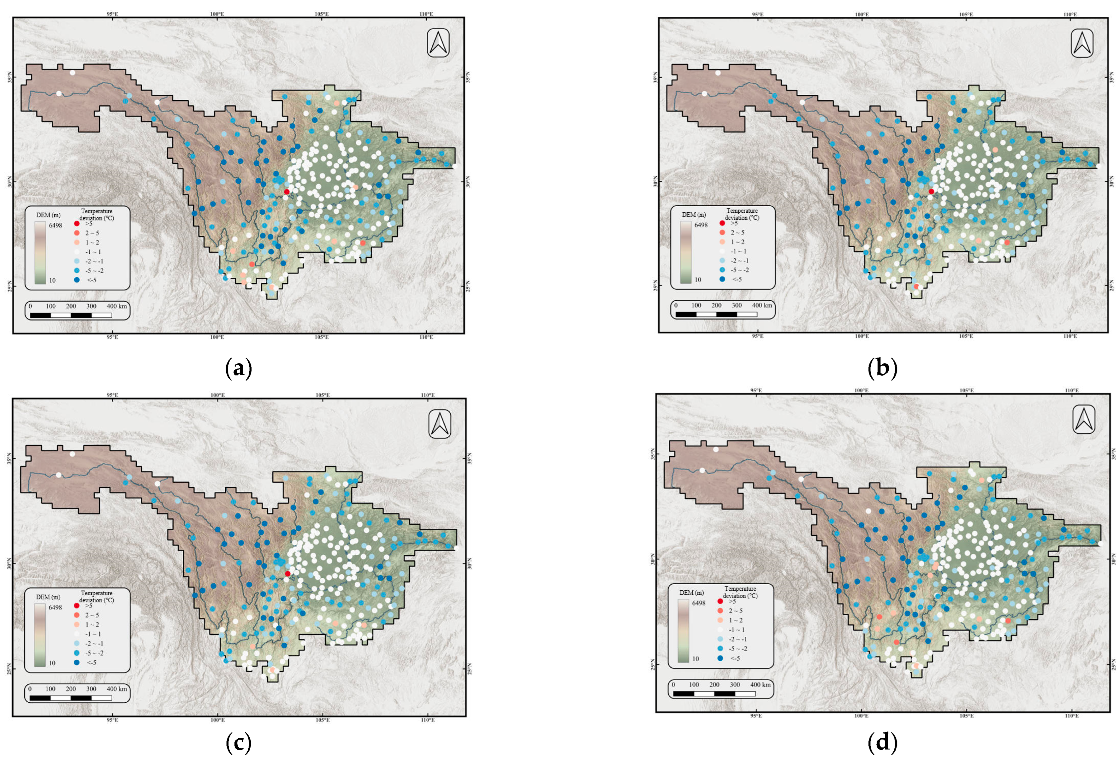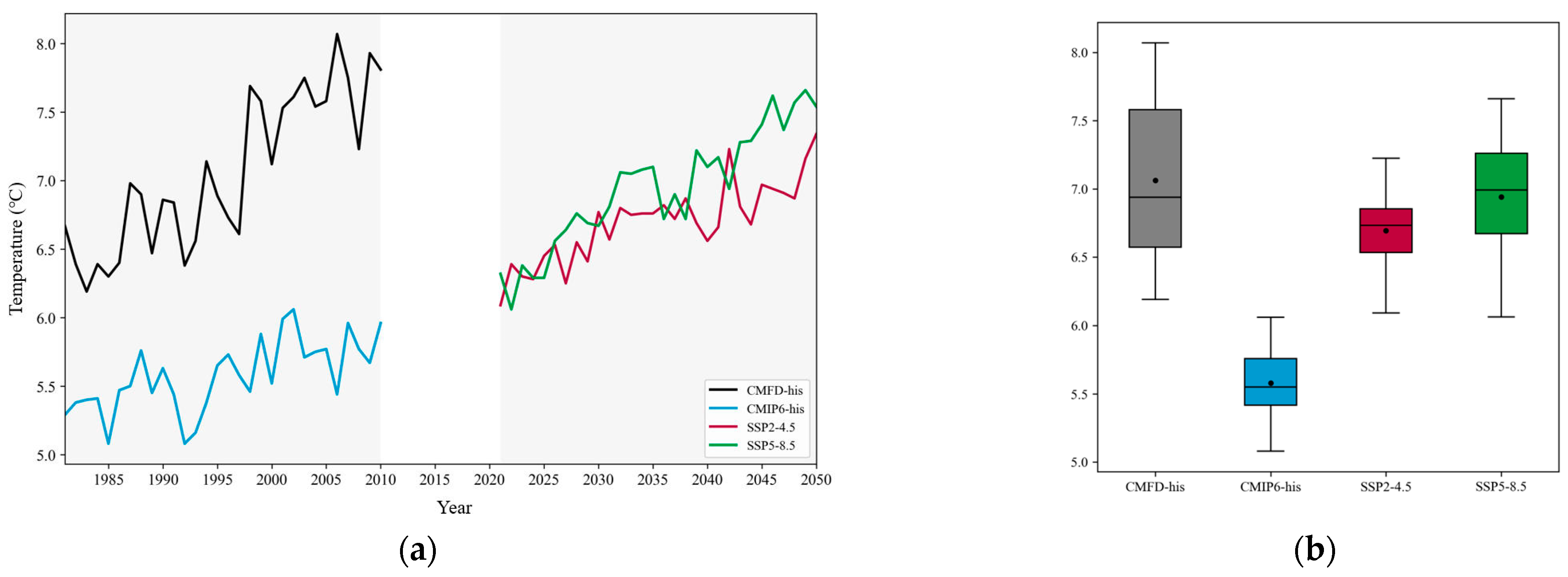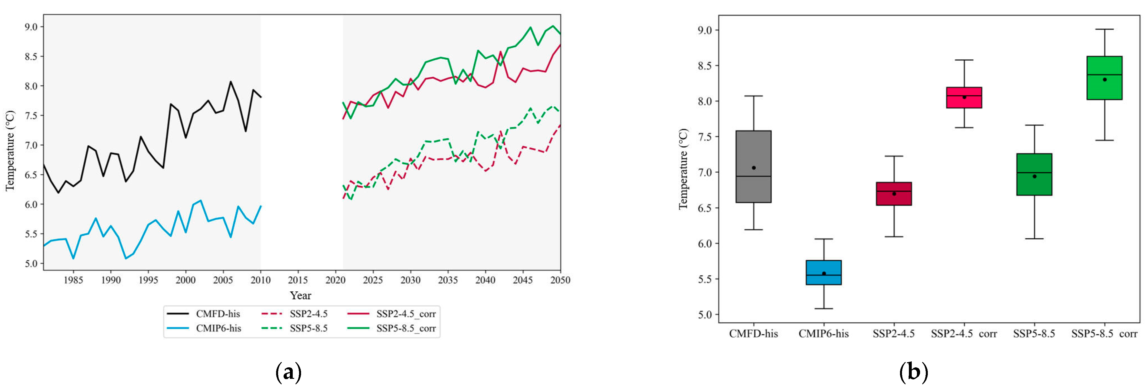 3.1. CMIP6 Simulation Data Bias Evaluation and Correction Results