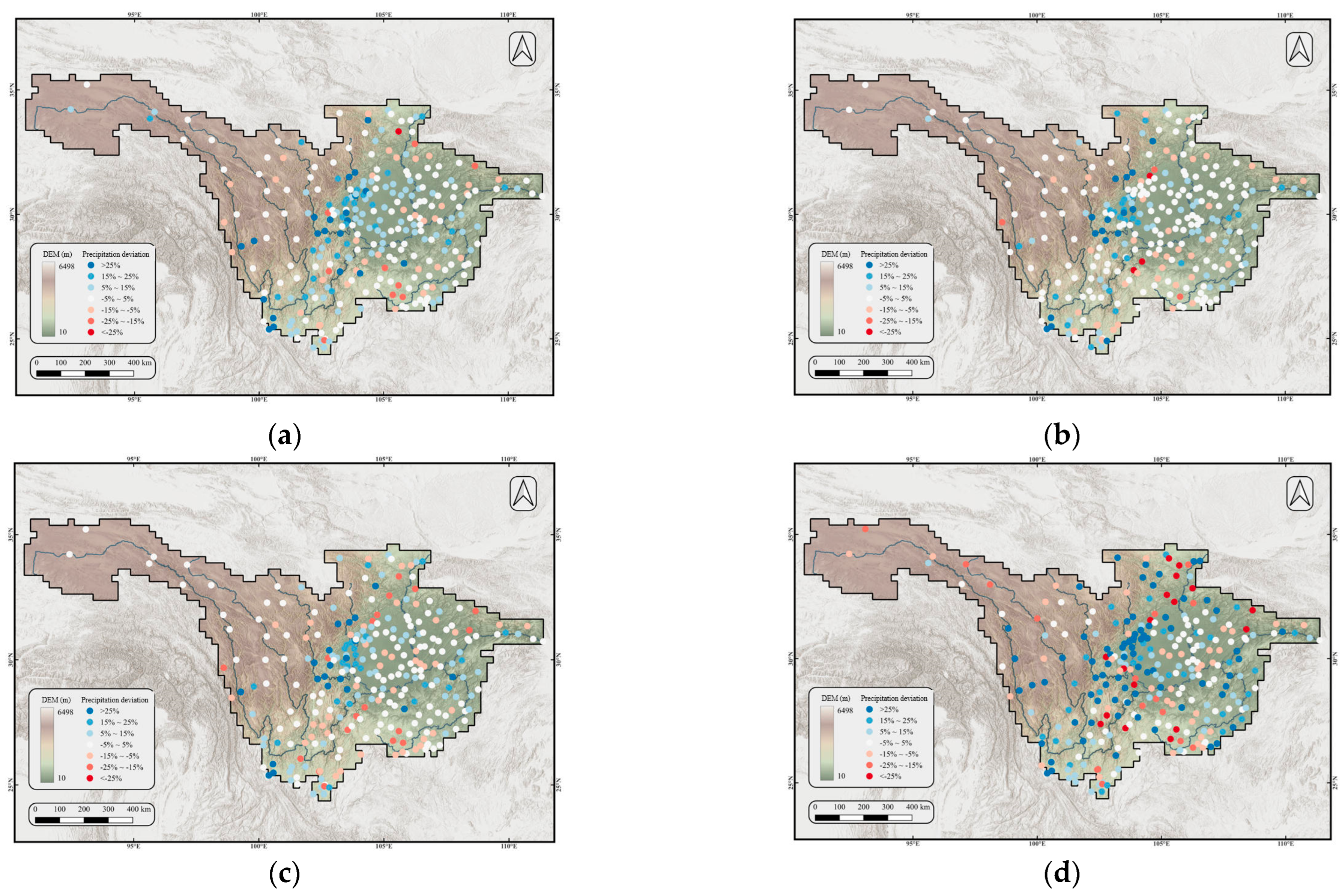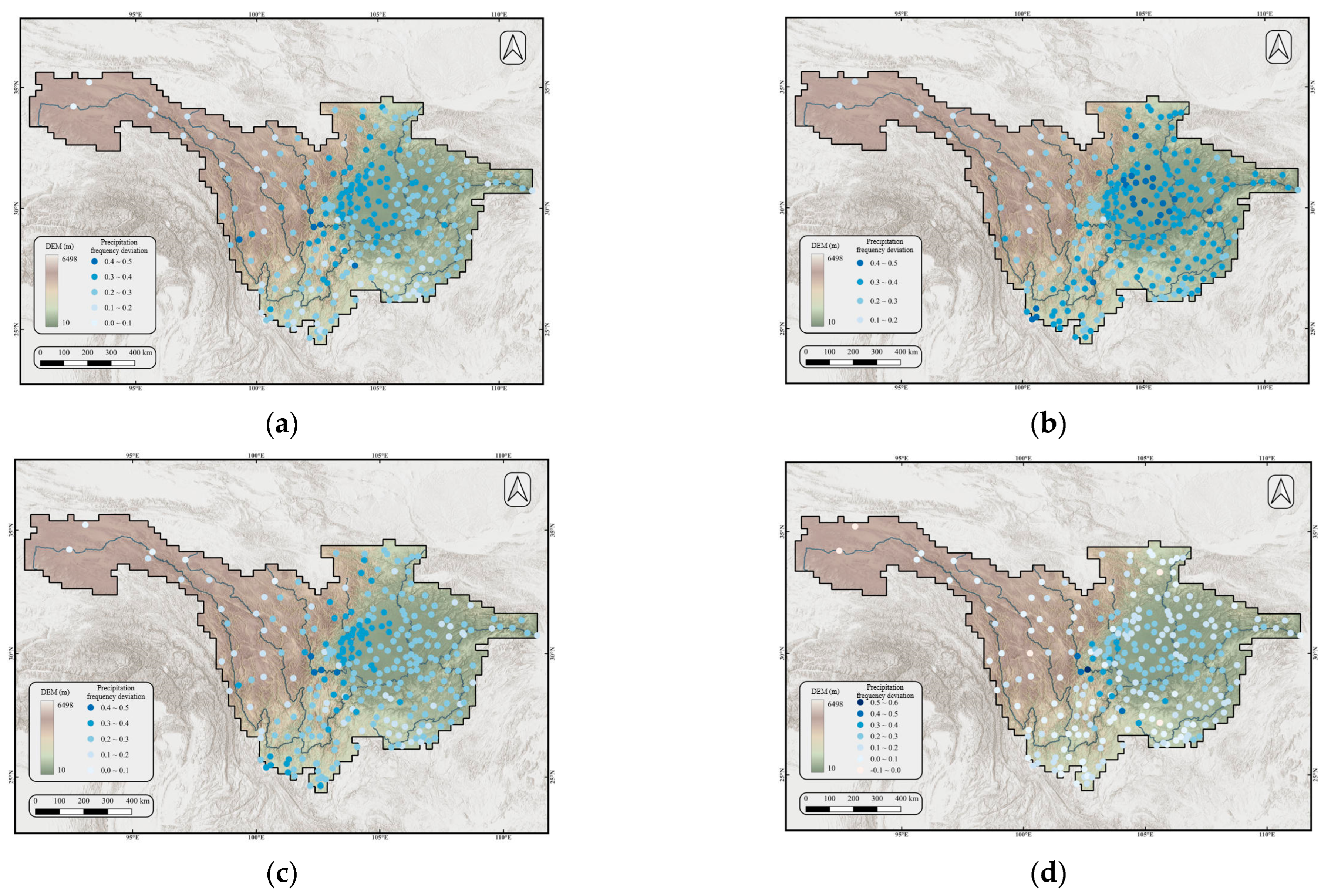 - Yang, R.; Xing, B. Spatio-Temporal Variability in Hydroclimate over the Upper Yangtze River Basin, China. Atmosphere 2022, 13, 317. [Google Scholar] [CrossRef]