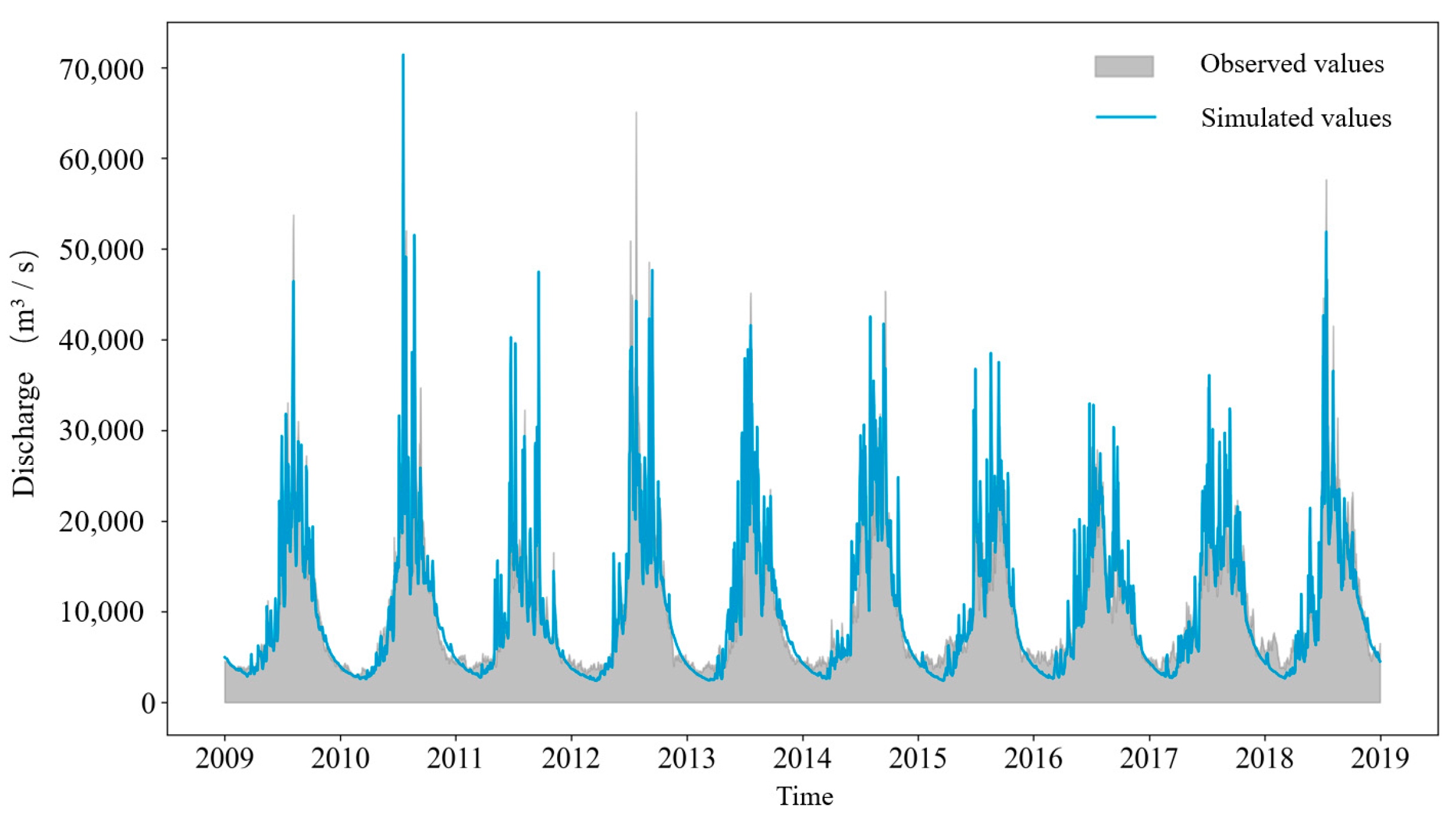 - Hydrological modeling with WRF-Hydro: A WRF-Hydro-based hydrological modeling system tailored to the upper Yangtze River Basin was developed to address parameter optimization challenges in simulating complex hydrological processes. Based on parameter sensitivity analysis, seven key hydrological parameters (including REFKDT) were selected, and a two-stage calibration strategy of “independent sub-basin calibration + mainstem calibration” was adopted. First, parallel parameter optimization was conducted for the Jinsha, Min-Tuo, Jialing, and Wu Rivers, each using independent parameter sets; then, the mainstem calibration was performed using the optimized sub-basin results. This approach significantly improved simulation performance at Yichang station, increasing the NSE from 0.72 (basin-wide calibration) to 0.85 (+18%), reducing RSR from 0.53 to 0.39 (−26%), and bringing PBIAS close to zero. Validation with observed discharge (2009–2018) confirmed the robustness of the approach, with NSE reaching 0.82 for daily flows, 0.86 for 5-day averages, and 0.91 for monthly flows at Cuntan station. Compared with SWAT-based studies in similar regions, the WRF-Hydro model demonstrated superior simulation accuracy.