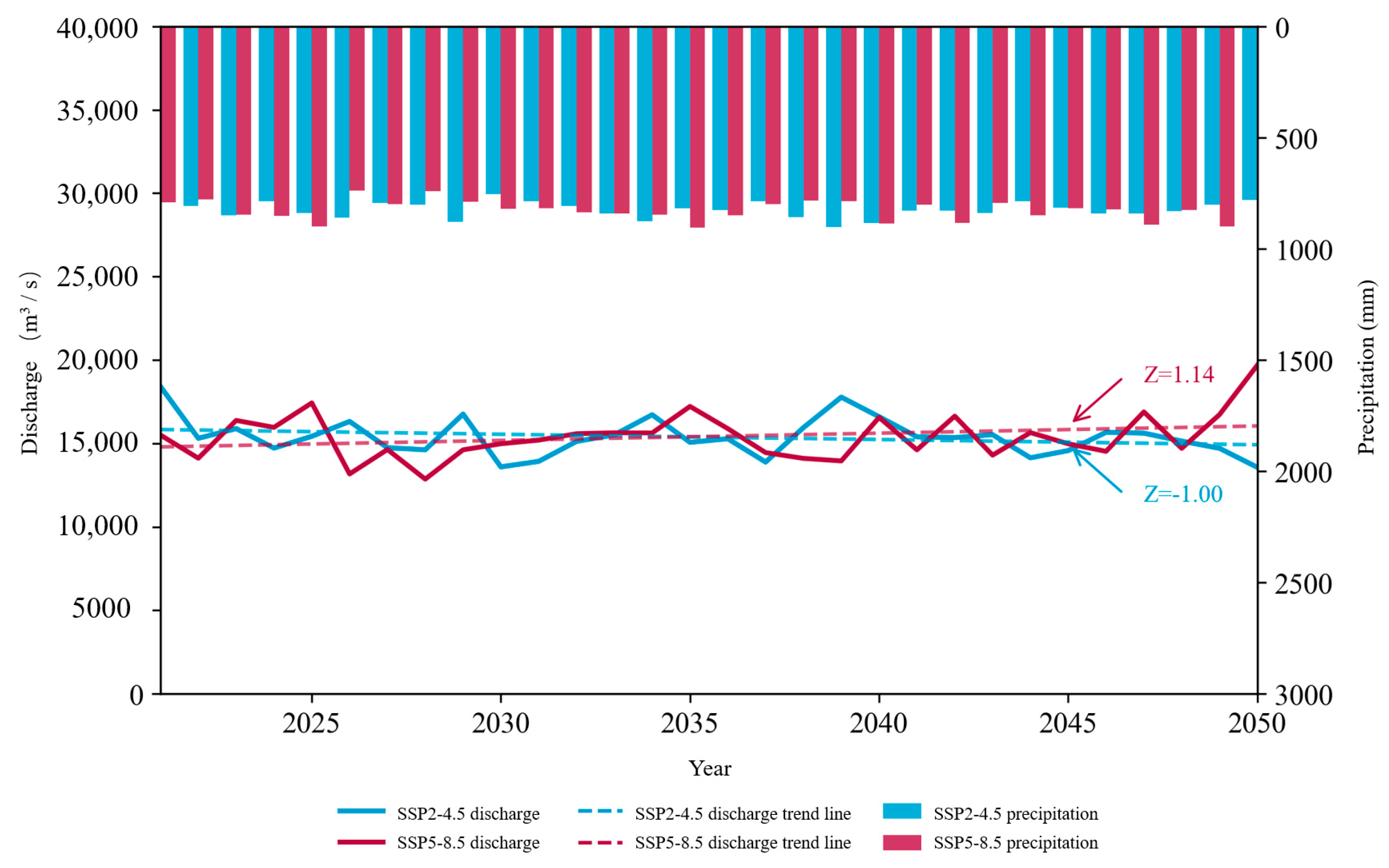 - Future climate and runoff changes: Based on bias-corrected CMIP6 multi-model data and WRF-Hydro simulations, climate and runoff characteristics for 2021–2050 were assessed under SSP2-4.5 and SSP5-8.5 scenarios. Results indicate that annual mean precipitation will increase by 5.4% (SSP2-4.5) to 6.1% (SSP5-8.5), while temperatures will rise by 1.0 °C (SSP2-4.5) to 1.2 °C (SSP5-8.5). Seasonally, autumn precipitation will increase most significantly, while winter warming will be the most pronounced. Spatially, precipitation increases are concentrated in the Sichuan Basin and the eastern basin, while warming is strongest in the Sichuan Basin and surrounding areas. Hydrological simulations suggest no statistically significant trend in annual mean discharge under either scenario. However, the Jinsha River’s mean discharge decreases by 3.1% under SSP5-8.5 relative to SSP2-4.5, whereas the Jialing and Wu Rivers exhibit slight increases. Although SSP5-8.5 shows only a minor decrease in mean flood-season daily runoff (−33 m3/s) compared with SSP2-4.5, the frequency of extreme flood events at the Three Gorges Reservoir increases substantially, from two events under SSP2-4.5 to five events under SSP5-8.5. Contribution analysis of seven flood events shows that the Jialing River was the dominant source in six of them, with contributions ranging from 60.0% to 99.1%.