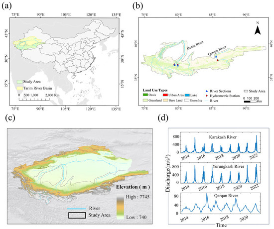 The study area. (a) The location of the rivers on the northern slope of the Kunlun Mountains. (b) Spatial distribution of land use types, major rivers, hydrological stations, and river sections. (c) Elevation of the study area. (d) Interannual runoff variations in three representative rivers: the Karakash and Yurungkash Rivers (tributaries of the Hotan River, daily discharge data) and the Qarqan River (monthly discharge data).