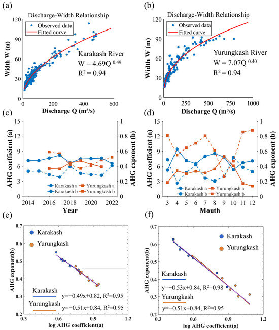 Overall, the AHG parameters of rivers exhibit distinct spatiotemporal heterogeneity. The annual variation coefficients of the AHG exponent b are below 7% for both the Karakash and Yurungkash Rivers, demonstrating high temporal stability in the stable channels of this arid region. This stability likely stems from the bedrock or cobble composition of the riverbeds in the study area, which provides strong erosion resistance and results in minimal interannual changes in channel morphology. Notably, although the goodness-of-fit for AHG decreases during the dry season (R2 < 0.45), the parameters still maintain a certain log-linear co-variation pattern. This indicates that the AHG structure maintains hydraulic consistency across seasons in arid-region rivers, providing a structural basis for model adjustments during low-flow periods.