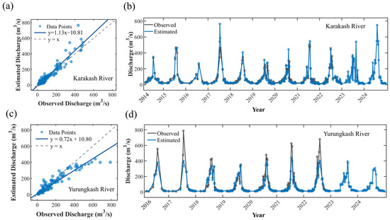 To discuss the AHG model’s ability to invert river discharge with limited data, hydrological station observation data from a single year were used to calibrate the AHG parameters, while data from other years served as the validation set. The validation results of the single-year AHG exponent model are listed in Table 3 and presented in Figure 3. For the Yurungkash River, the single-year AHG model has an average RMSE of 43.52 m3/s, an average RMMSE of 51.69%, and an average NSE of 0.89; for the Karakash River, the corresponding indicators are 28.44 m3/s, 35.82%, and 0.90, respectively, indicating excellent model fitting performance for the Karakash River. It is particularly noteworthy that although only 13 cloud-free remote sensing images were available as data in 2016, the NSE values of the single-year AHG exponent model for both rivers still reached 0.93. The effectiveness of the AHG model is not related to the quantity of collected effective river width data, but rather to whether there are sufficient images that can reflect river width changes in different periods. Therefore, when limited flow observation data are sufficient to cover both the dry and wet seasons of the river, and the acquisition dates of the images are close to the observation dates of the flow, effective long-term runoff retrieval is still possible [47].