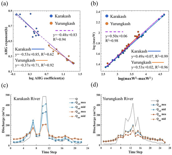 In contrast to interannual variations, the intra-annual fluctuations of the AHG exponent are more pronounced, as shown in Figure 2d. The standard deviations for the Karakash and Yurungkash Rivers are 0.08 and 0.11, with CVs of 17.43% and 36.40%, respectively. During the wet season (June–September), the exponent increases significantly, while it decreases during the dry season (December–February), exhibiting an overall convex pattern intra-annually. The goodness-of-fit for AHG relationships also varies seasonally, with better performance during the wet season (R2 > 0.80) than during the dry season (R2 < 0.45). An anomalously low fit (R2 < 0.40) was observed for the Yurungkash River in June, but after excluding the outlier from June 2018, the R2 improved to 0.82.