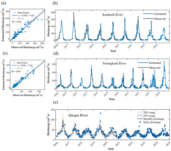 Comparison between Manning-Strickle Equation estimated discharge and observed discharge. (a,b) Scatter plots with fitted rating curves for station discharge versus retrieval discharge in the Karakash River. (c,d) scatter plots with fitted rating curves for station discharge versus retrieval discharge in the Yurungkash River. (e) distribution of retrieval discharge for the Qarqan River, where the dark gray curve represents monthly mean discharge with shaded ranges of ±25% and ±50% daily discharge variability to assess temporal consistency between daily and monthly scales.