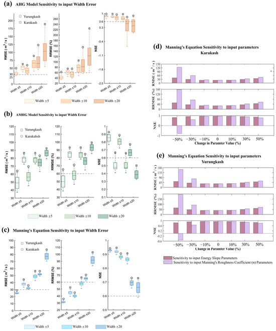 Parameter Sensitivity Analysis. (a–c) Sensitivity of different discharge retrieval models to input river width errors. (d,e) Sensitivity of Manning’s equation to variations in Manning’s n coefficient and hydraulic slope parameters.