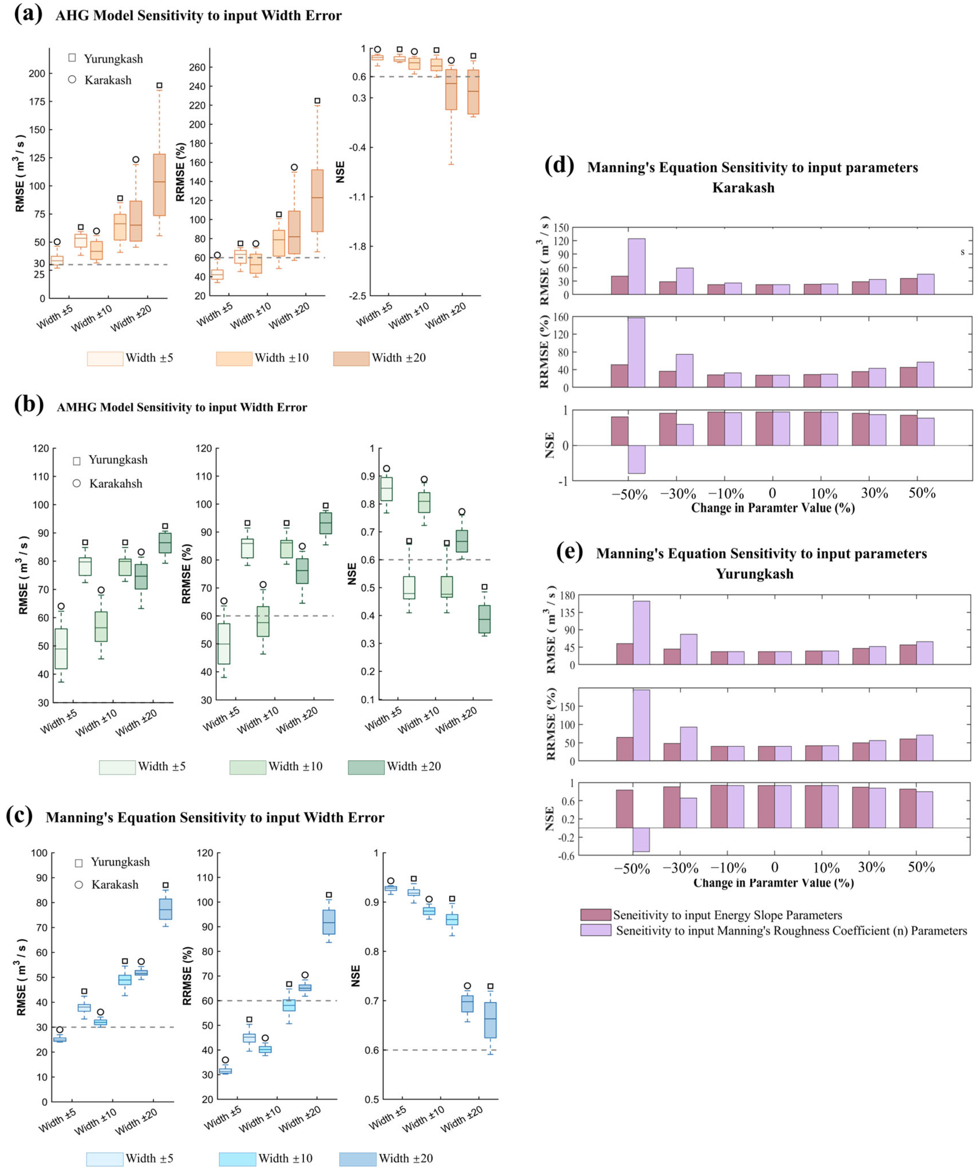 - Frasson, R.P.D.M.; Turmon, M.J.; Durand, M.T.; David, C.H. Estimating the Relative Impact of Measurement, Parameter, and Flow Law Errors on Discharge from the Surface Water and Ocean Topography Mission. J. Hydrometeorol. 2023, 24, 425–443. [Google Scholar] [CrossRef]