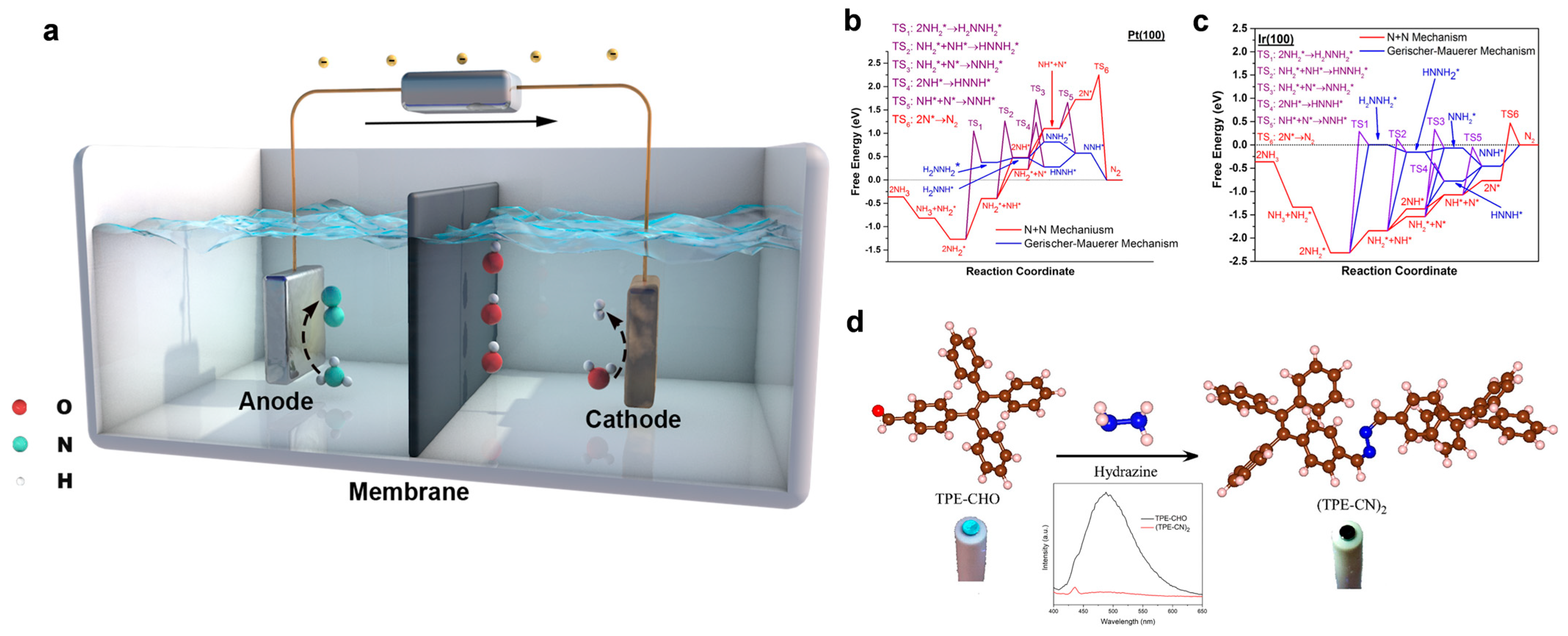 - Siddharth, K.; Alam, P.; Hossain, M.D.; Xie, N.; Nambafu, G.S.; Rehman, F.; Lam, J.W.Y.; Chen, G.; Cheng, J.; Luo, Z.; et al. Hydrazine Detection during Ammonia Electro-oxidation Using an Aggregation-Induced Emission Dye. J. Am. Chem. Soc. 2021, 143, 2433–2440. [Google Scholar] [CrossRef] [PubMed]