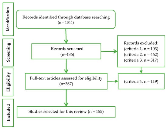 The initial database search (ScienceDirect, Scopus, and Google Scholar) returned 1344 publications for review. To ensure linguistic consistency, only papers published in English were included (criterion 1), resulting in 1241 documents being selected. Subsequently, studies published between 2005 and 2025 were selected (criterion 2), reducing the dataset to 882 documents. In the next stage, only publications in the field of environmental science were retained, whereas those primarily focused on agriculture, hydrology, medicine, social sciences and economics were excluded (criterion 3). This filtering resulted in 486 documents, comprising 369 journal articles, 63 conference papers, 47 reviews, and 7 book chapters. A full-text eligibility assessment was then performed, leading to the exclusion of 119 articles that either lacked full-text access or did not provide sufficient methodological information (criterion 4). Consequently, 367 studies were retained for detailed analysis, of which 143 met all the inclusion criteria and were incorporated into the final systematic review and bibliometric analysis. The bibliographic data for this analysis was limited to 155 articles.